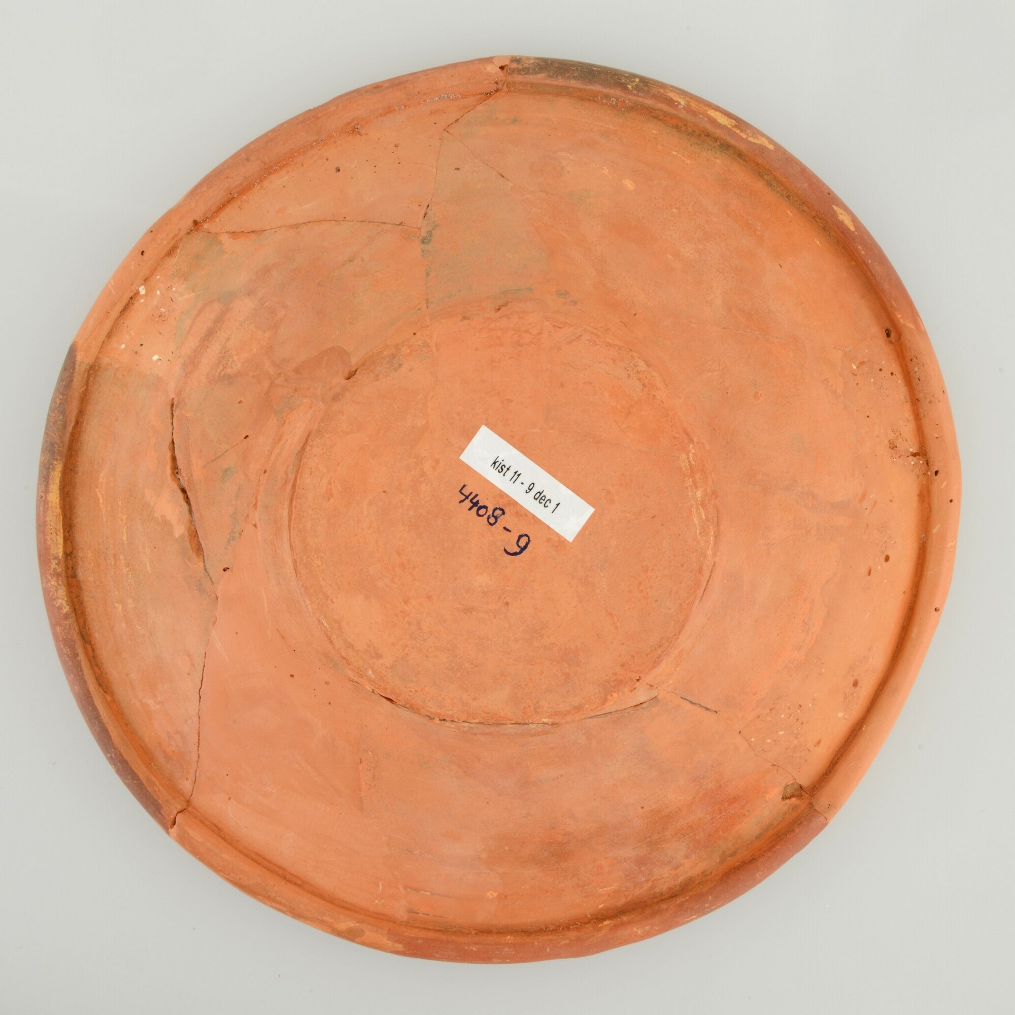 Schotel; wa-bor-1; roodbakkend; halffabricaat, biscuit; slibversiering, slib-krastechniek; vl: concentrische cirkels, ornamentbanden, sp: achtpuntige maan, initialen DCS en jaartal 1605; standvlak; productieplaats: Enkhuizen