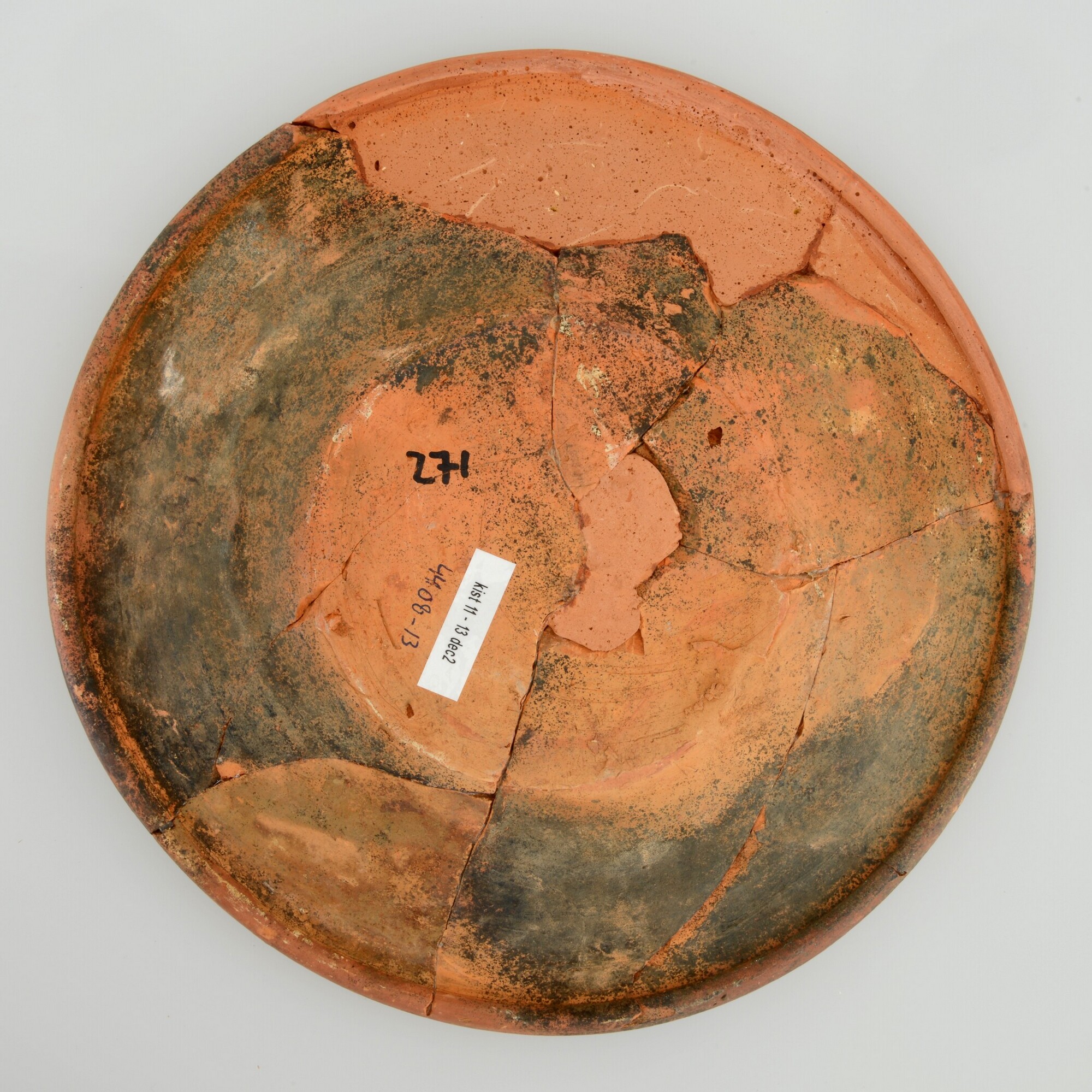 Schotel; wa-bor-1; roodbakkend; halffabricaat, biscuit; slibversiering, slib-krastechniek; vl: concentrische cirkels, ornamentbanden, sp: Adam en Eva, initialen DCS en jaartal 1605; standvlak; productieplaats: Enkhuizen