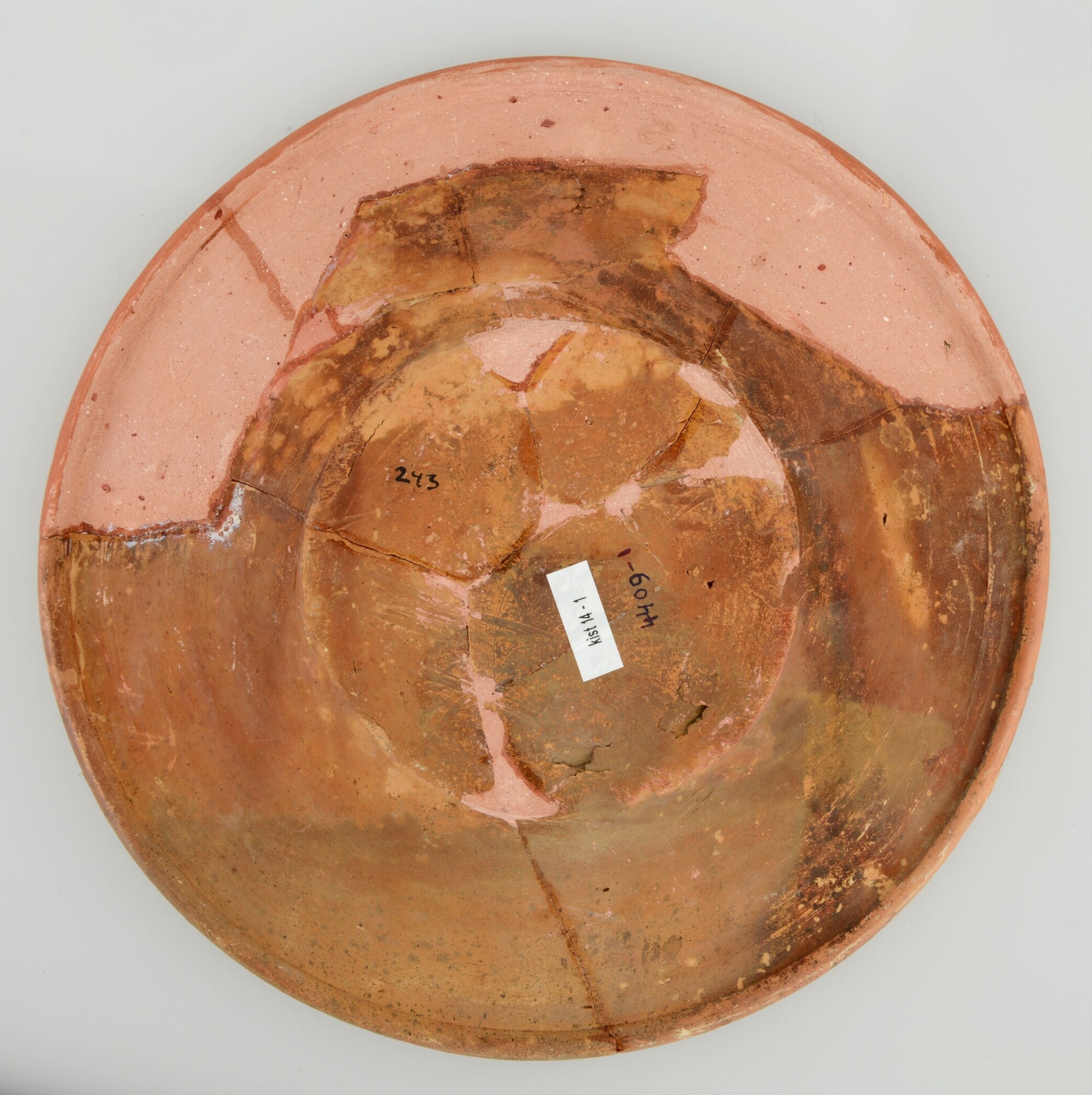Schotel; wa-bor-1; roodbakkend; halffabricaat, biscuit; slibversiering, slib-krastechniek; vl: concentrische cirkels, ornamentbanden, sp: drie distelbloemen; standvlak; productieplaats: Enkhuizen