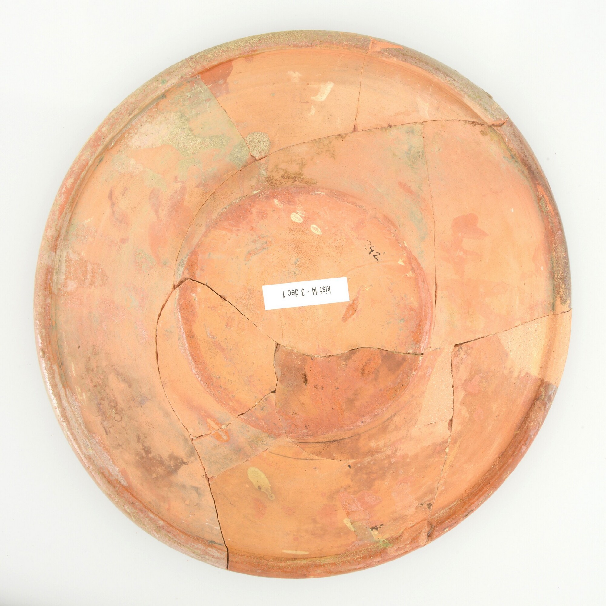 Schotel; wa-bor-1; roodbakkend; verbrand; loodglazuur; slibversiering, slib-krastechniek;vl: concentrische cirkels, ornamentbanden, sp: eikel en jaartal 1605; standvlak; productieplaats: Enkhuizen