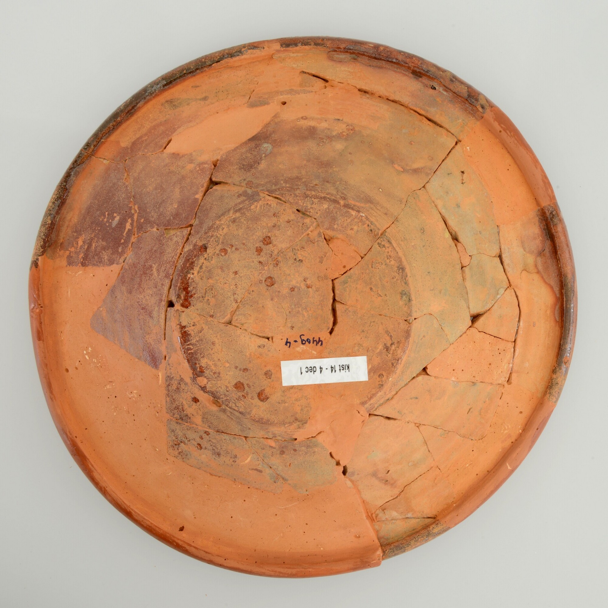 Schotel; wa-bor-1; roodbakkend; verbrand; loodglazuur; slibversiering, slib-krastechniek;vl: concentrische cirkels, ornamentbanden, sp: vrouwenkop, initialen DCS en jaartal 1605; standvlak; productieplaats: Enkhuizen