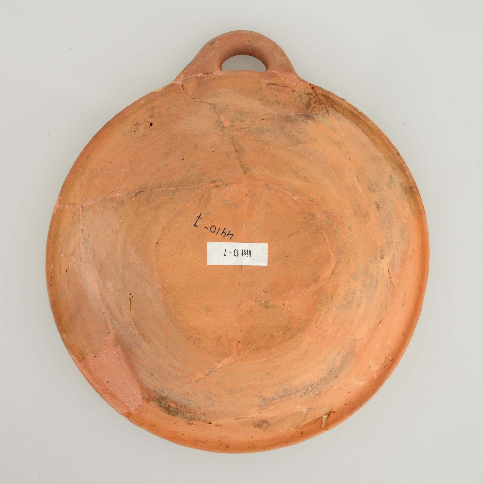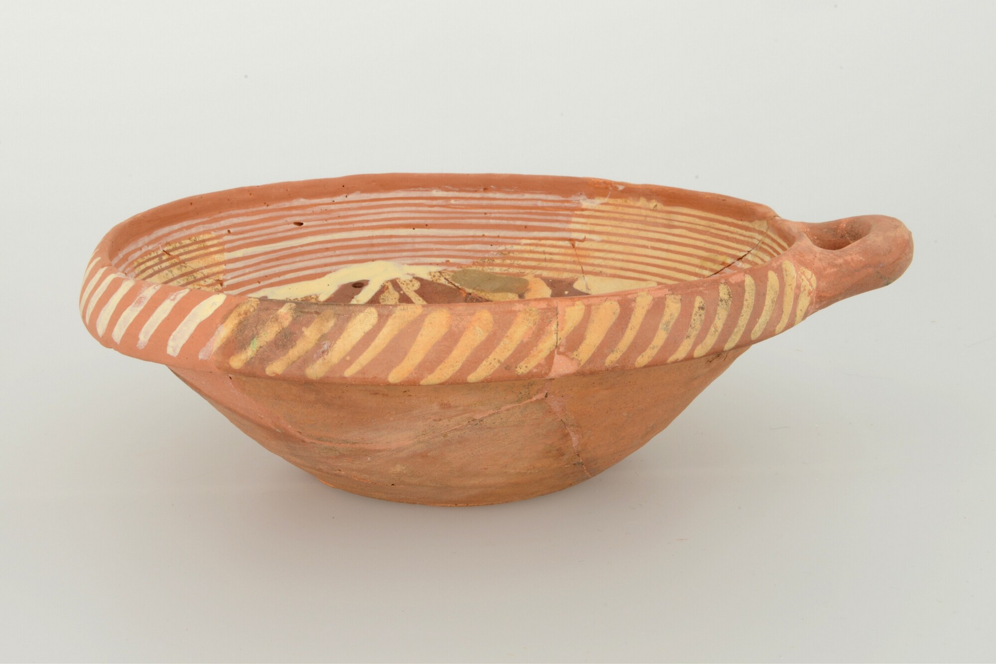 Kom; wa-kom-1; roodbakkend; halffabricaat, biscuit; slibversiering, slib-krastechniek; vl: concentrische cirkels, ornamentbanden, sp: drie distelbloemen; standvlak; één horizontaal worstoor; productieplaats: Enkhuizen