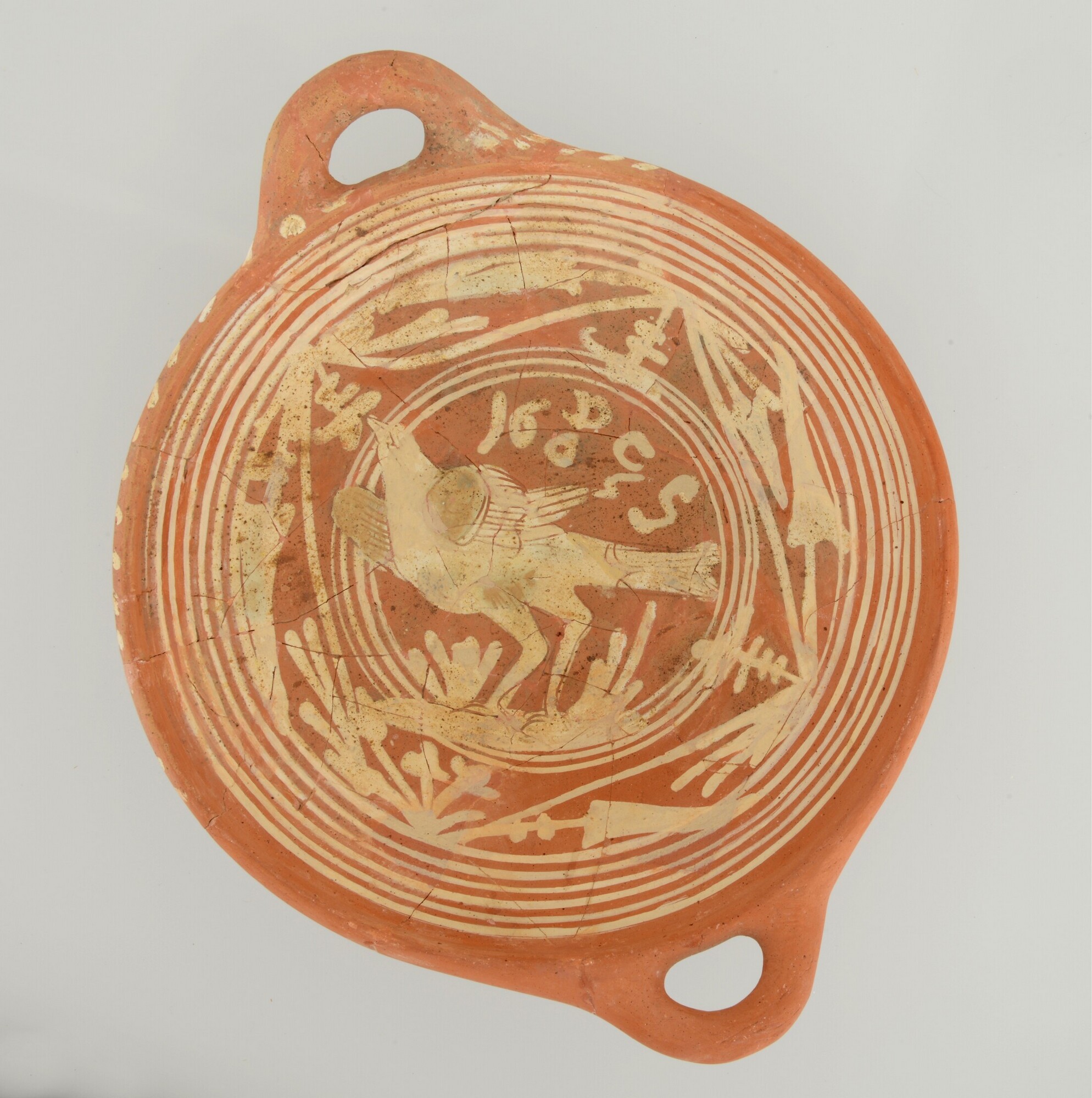 Kom; wa-kom-1; roodbakkend; halffabricaat, biscuit; slibversiering, slib-krastechniek; vl: concentrische cirkels, ornamentbanden, sp: vogel met gespreide vleugels, initialen DCS en jaartal 1605; standvlak; twee horizontale worstoren; productieplaats: Enkhuizen