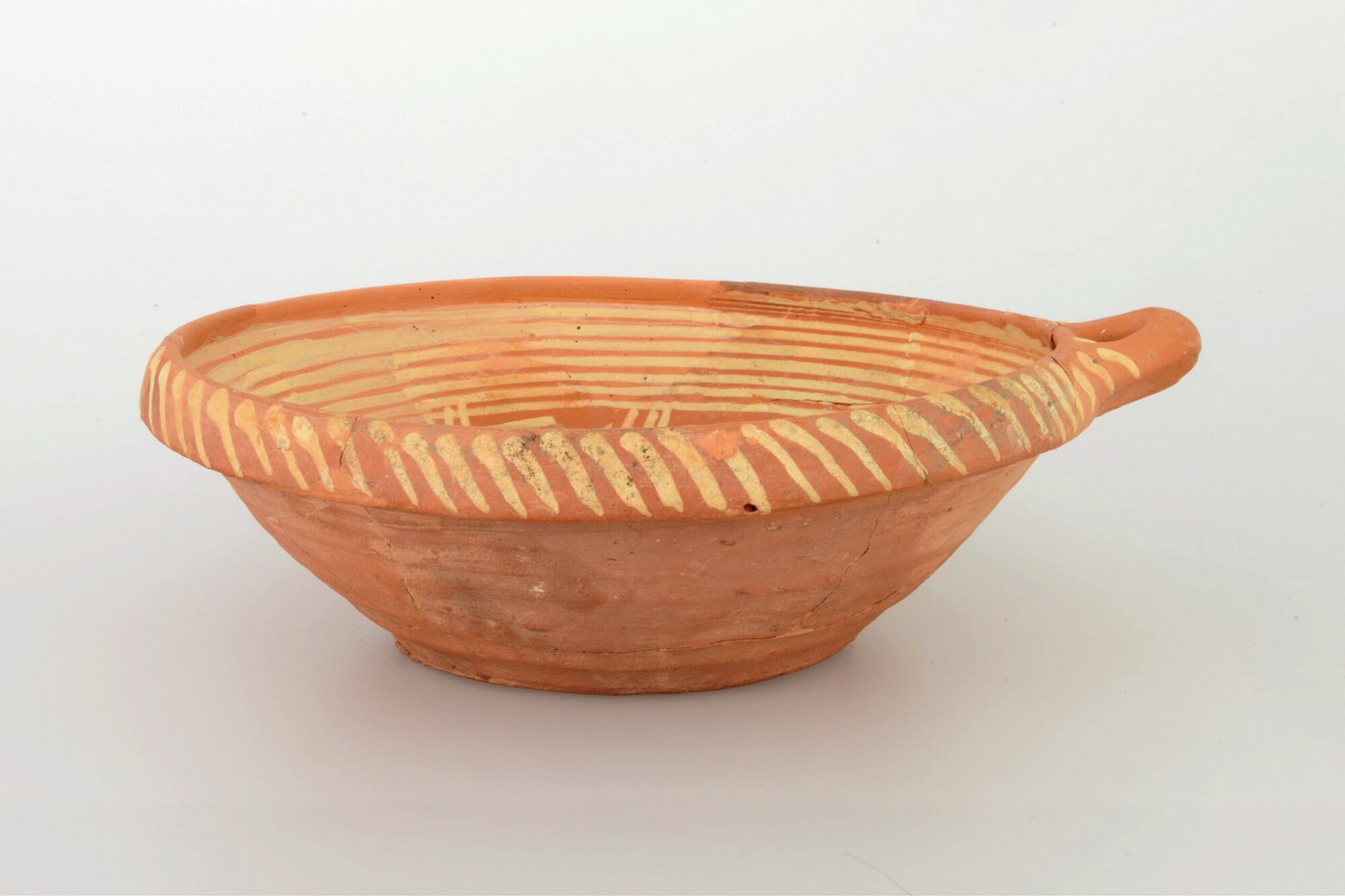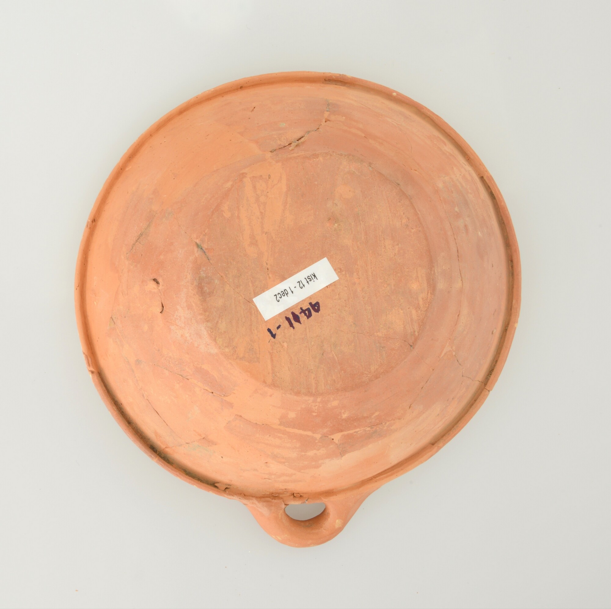 Kom; wa-kom-1; roodbakkend; halffabricaat, biscuit; slibversiering, slib-krastechniek; vl: concentrische cirkels, ornamentbanden, sp: Adam en Eva en jaartal 1606; standvlak; één horizontaal worstoor; productieplaats: Enkhuizen