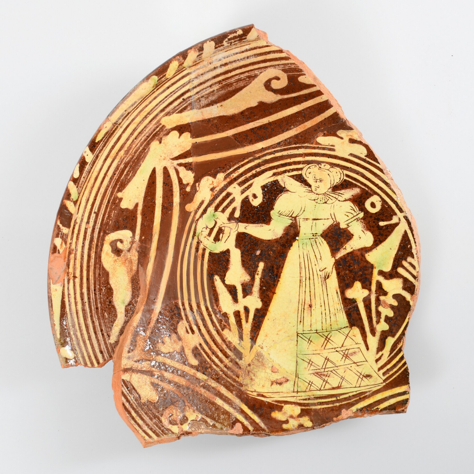 Schotel; wa-bor-1, roodbakkend, verbrand; loodglazuur; vl: concentrische cirkels, ornamentbanden, sp: dame met krans of tamboerijn en jaartal 1605; standvlak; productieplaats: Enkhuizen