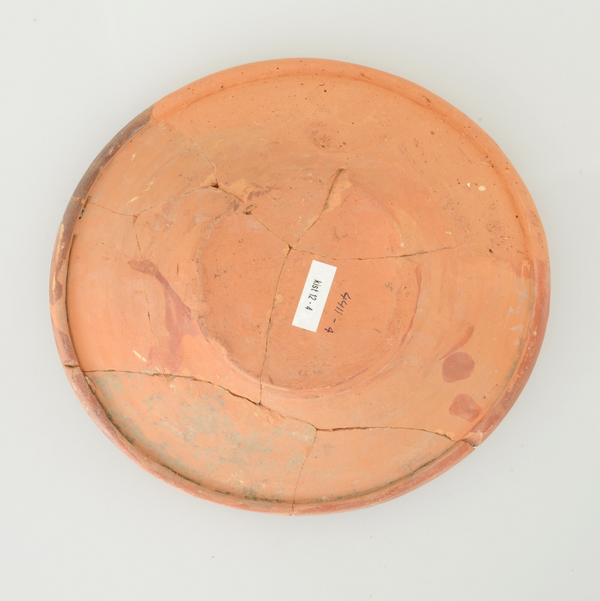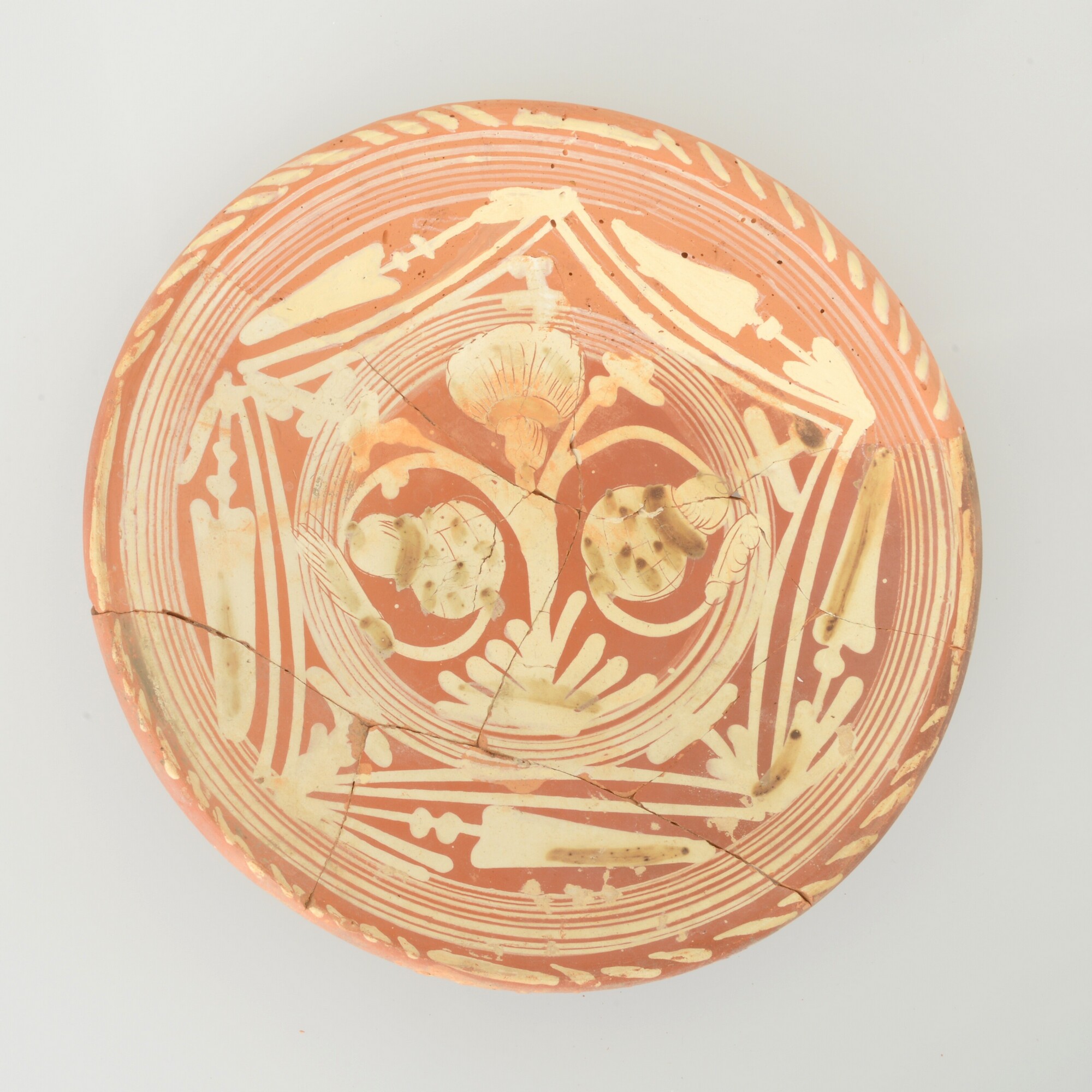 Schotel; wa-bor-1; roodbakkend; halffabricaat, biscuit; slibversiering, slib-krastechniek; vl: concentrische cirkels, ornamentbanden, sp: twee eikels met distel; standvlak; productieplaats: Enkhuizen