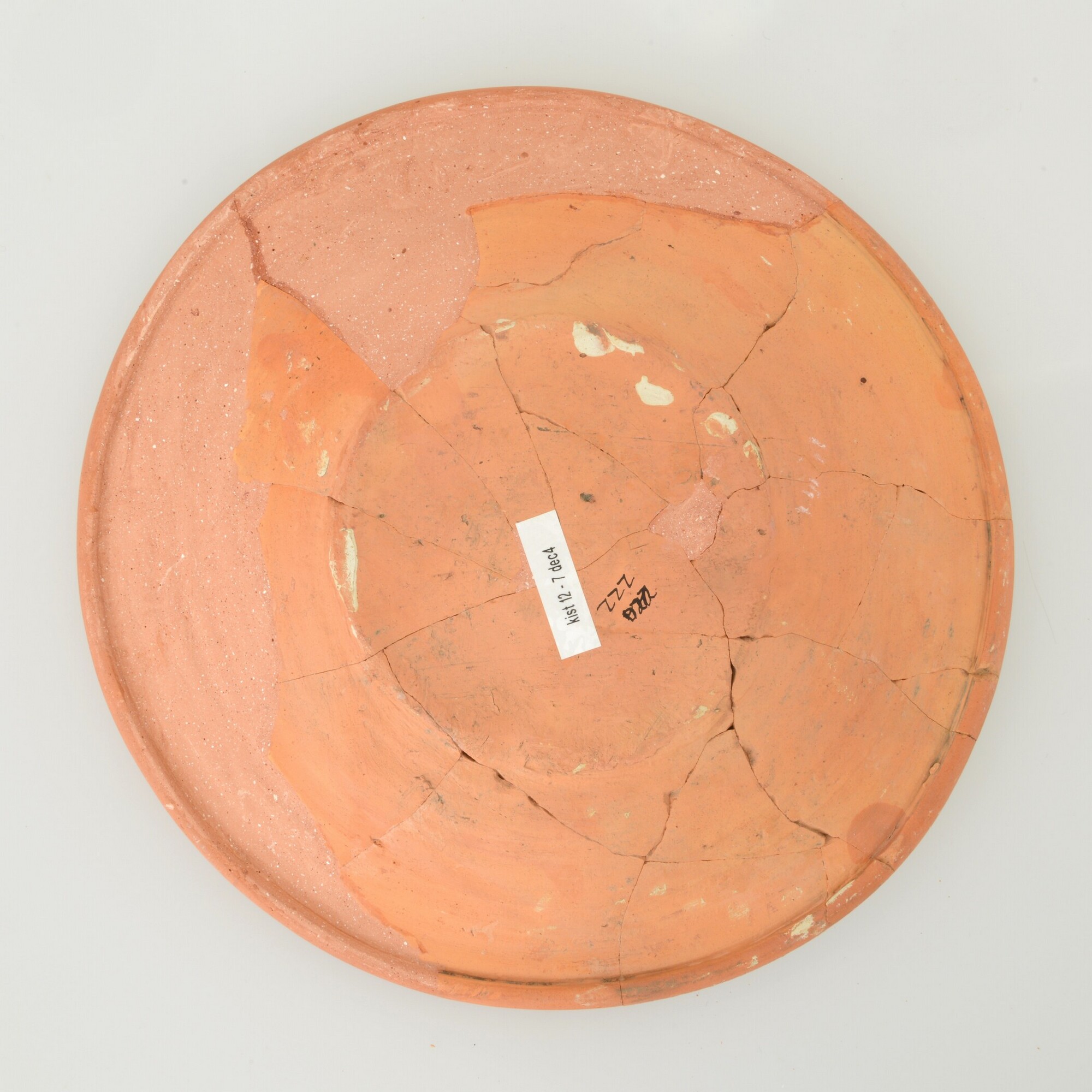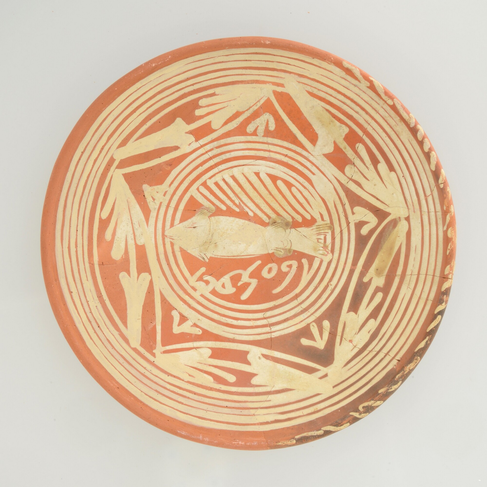 Schotel; wa-bor-1; roodbakkend; halffabricaat, biscuit; slibversiering, slib-krastechniek, vl: concentrische cirkels, ornamentbanden, sp: vis, jaartal 1605 en initialen DCS; standvlak; productieplaats: Enkhuizen