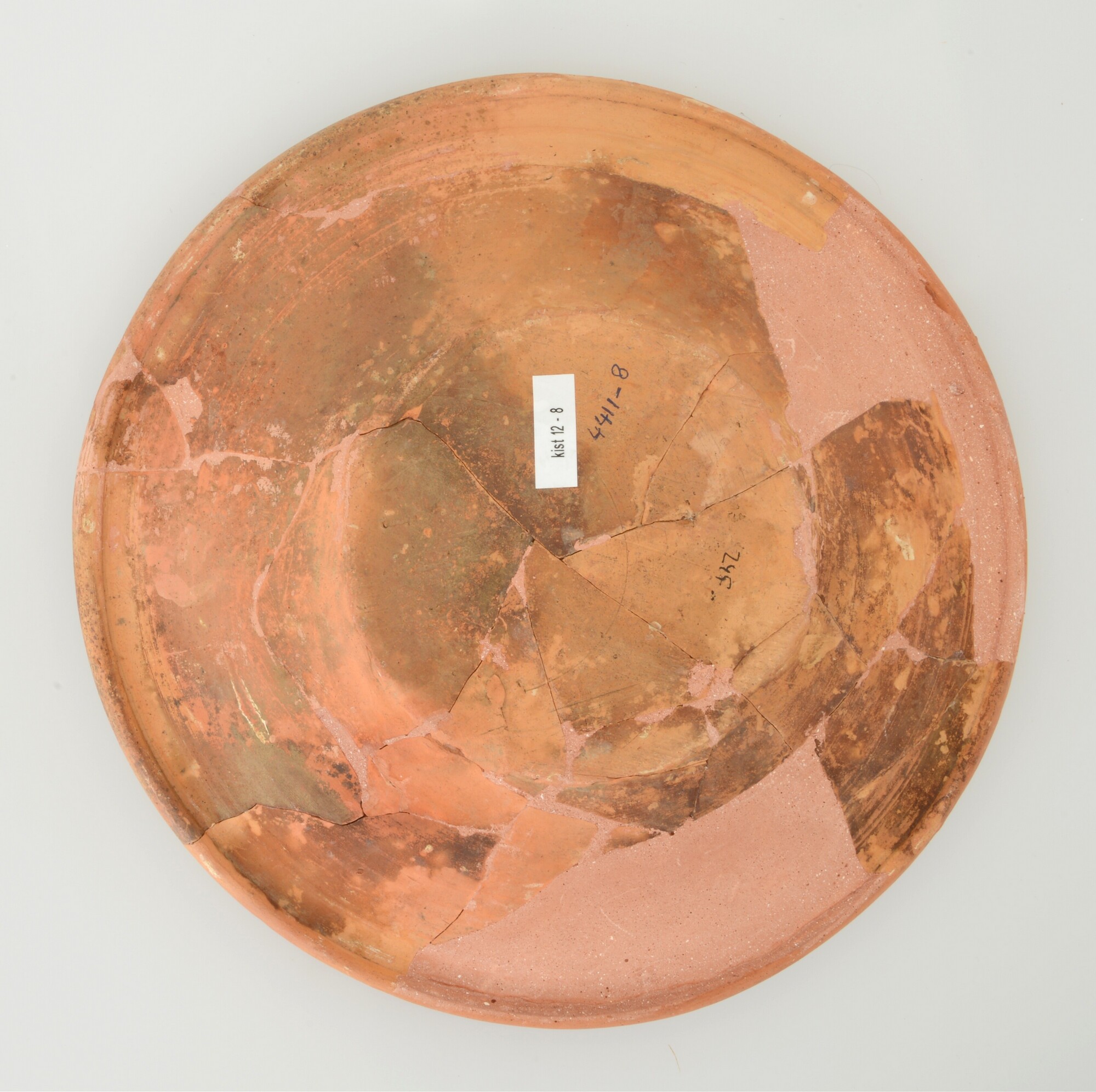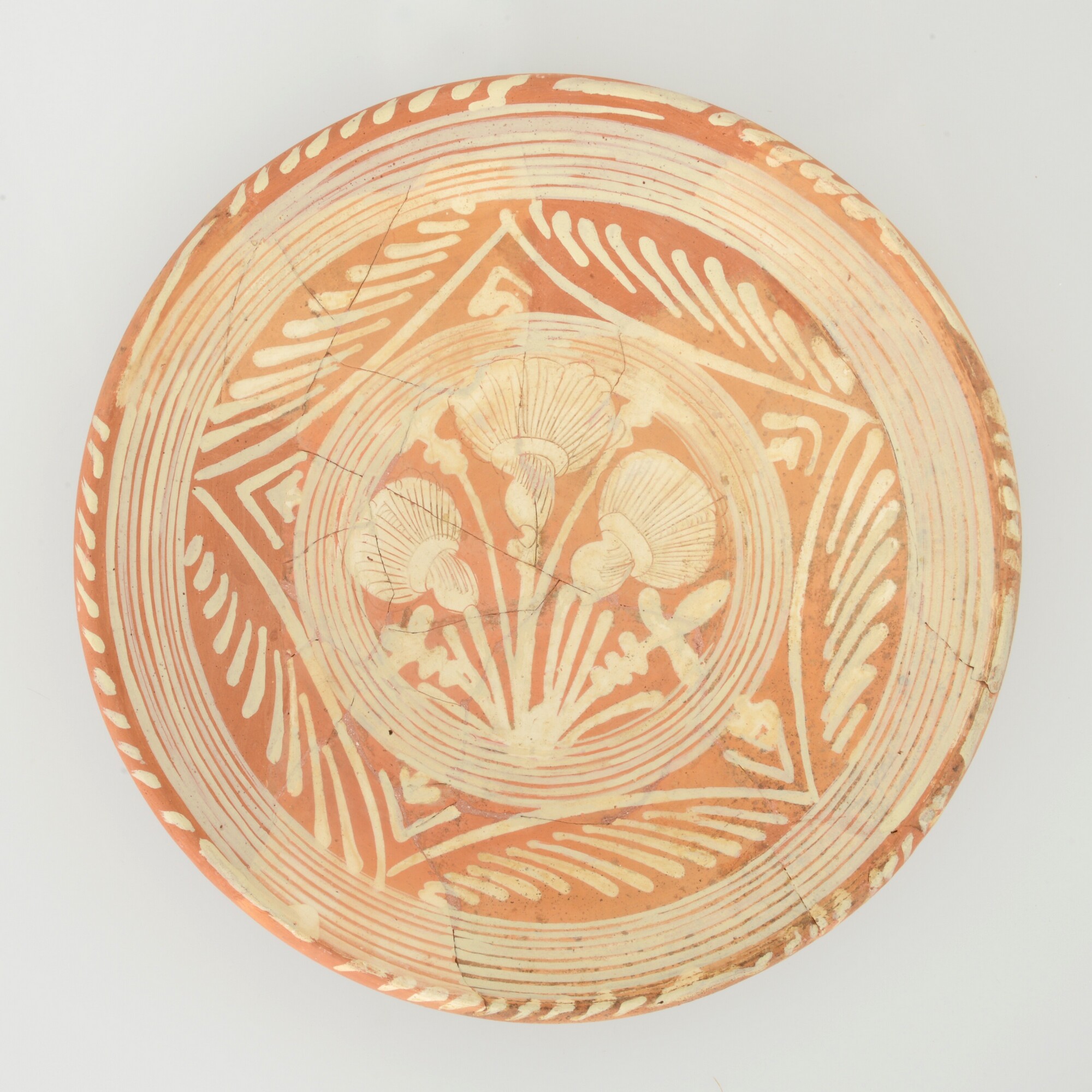Schotel; wa-bor-1; roodbakkend; halffabricaat, biscuit; slibversiering, slib-krastechniek; vl: concentrische cirkels, ornamentbanden, sp: drie distelbloemen; standvlak; productieplaats: Enkhuizen