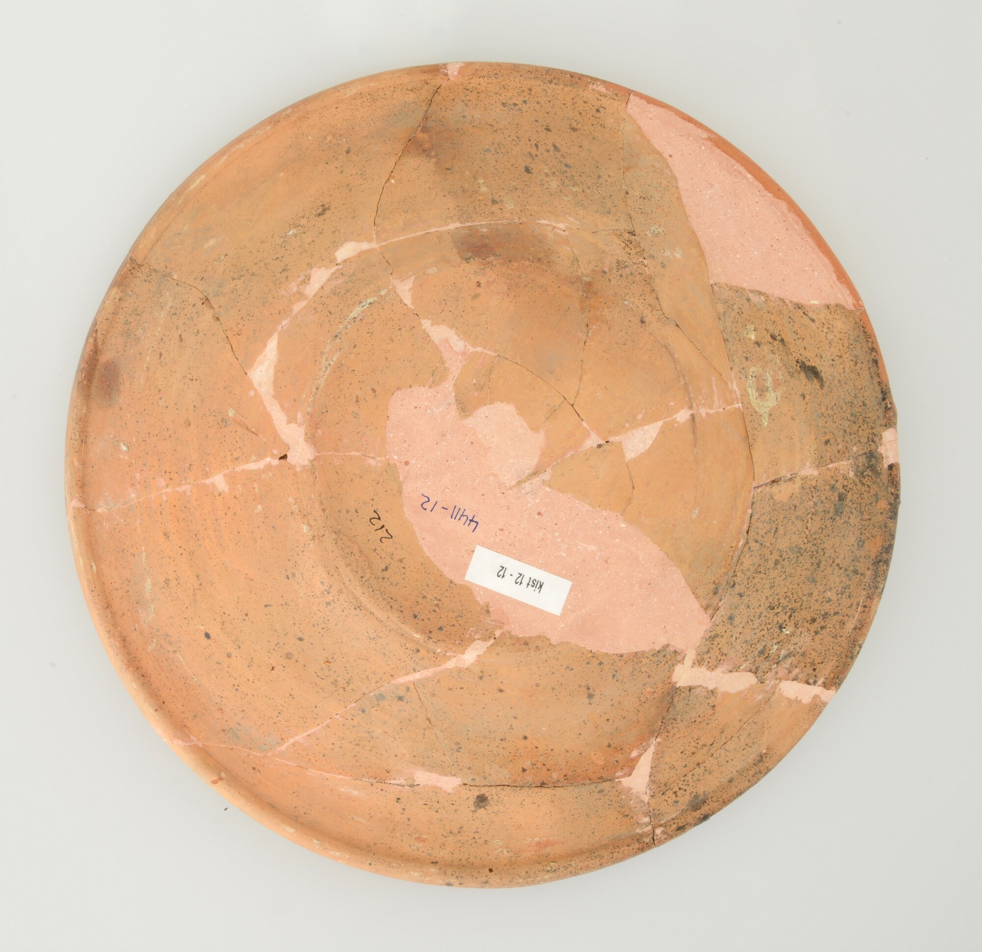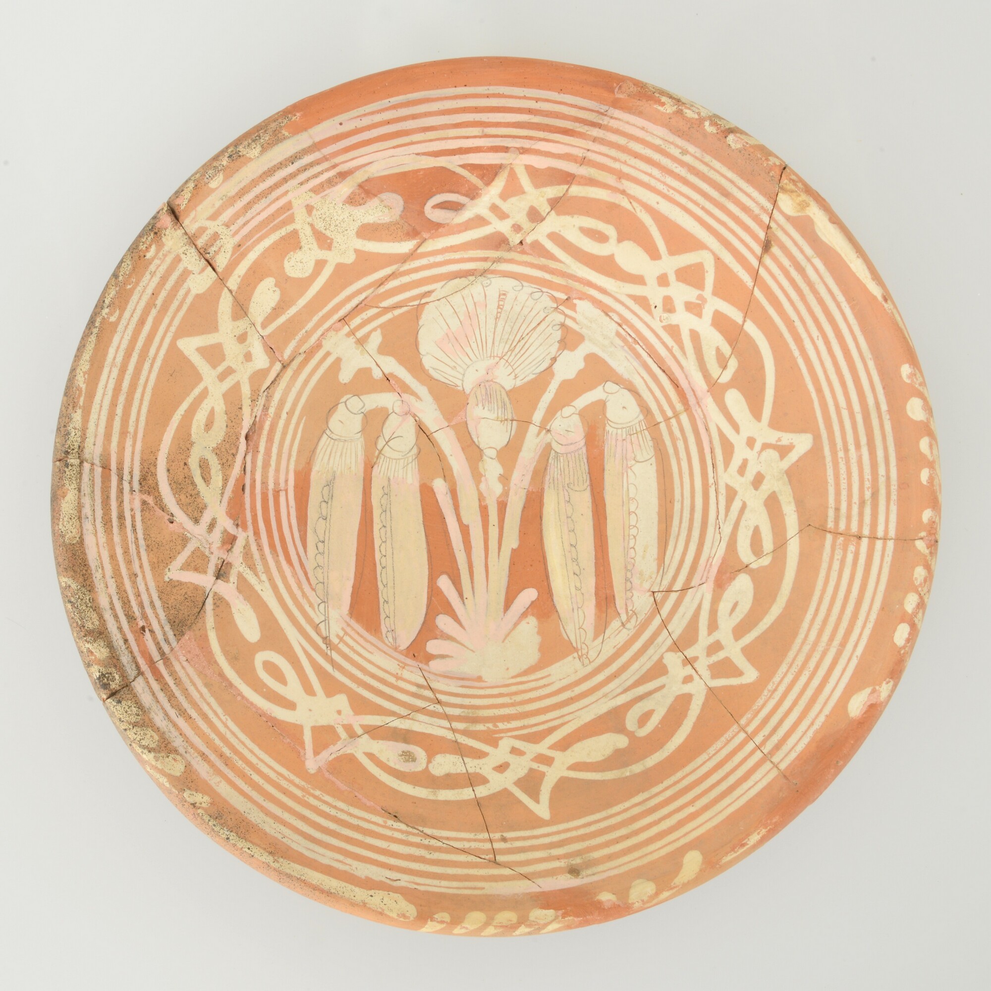 Schotel; wa-bor-1; roodbakkend; halffabricaat, biscuit; slibversiering, slib-krastechniek; vl: concentrische cirkels, ornamentbanden, sp: vier peulen met distel; standvlak; productieplaats: Enkhuizen