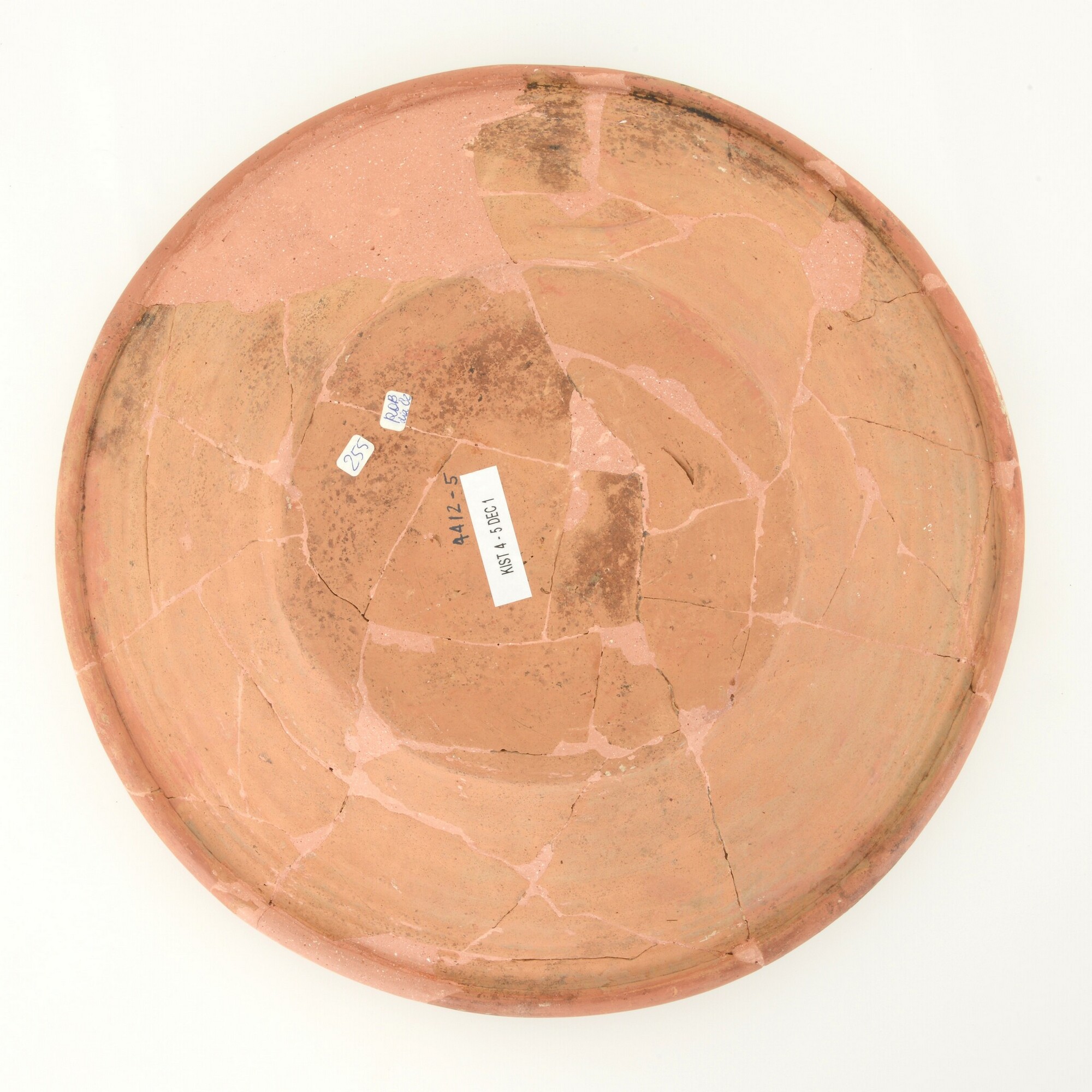 Schotel; wa-bor-1; roodbakkend; halffabricaat, biscuit; slibversiering, slib-krastechniek; vl: concentrische cirkels, ornamentbanden, sp: pauw, initialen DCS en jaartal 1605; standvlak; productieplaats: Enkhuizen