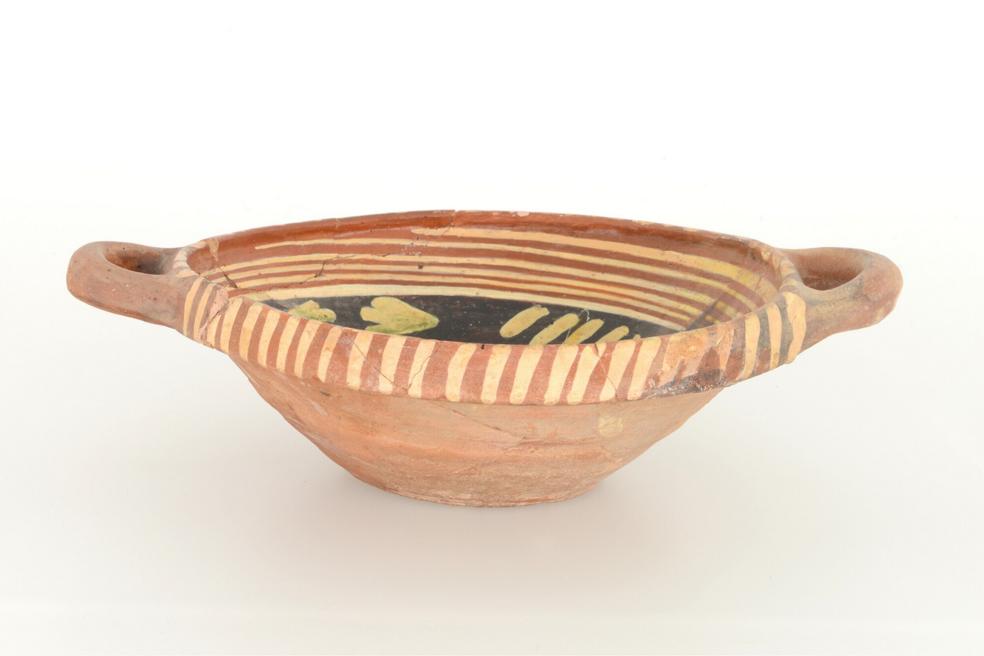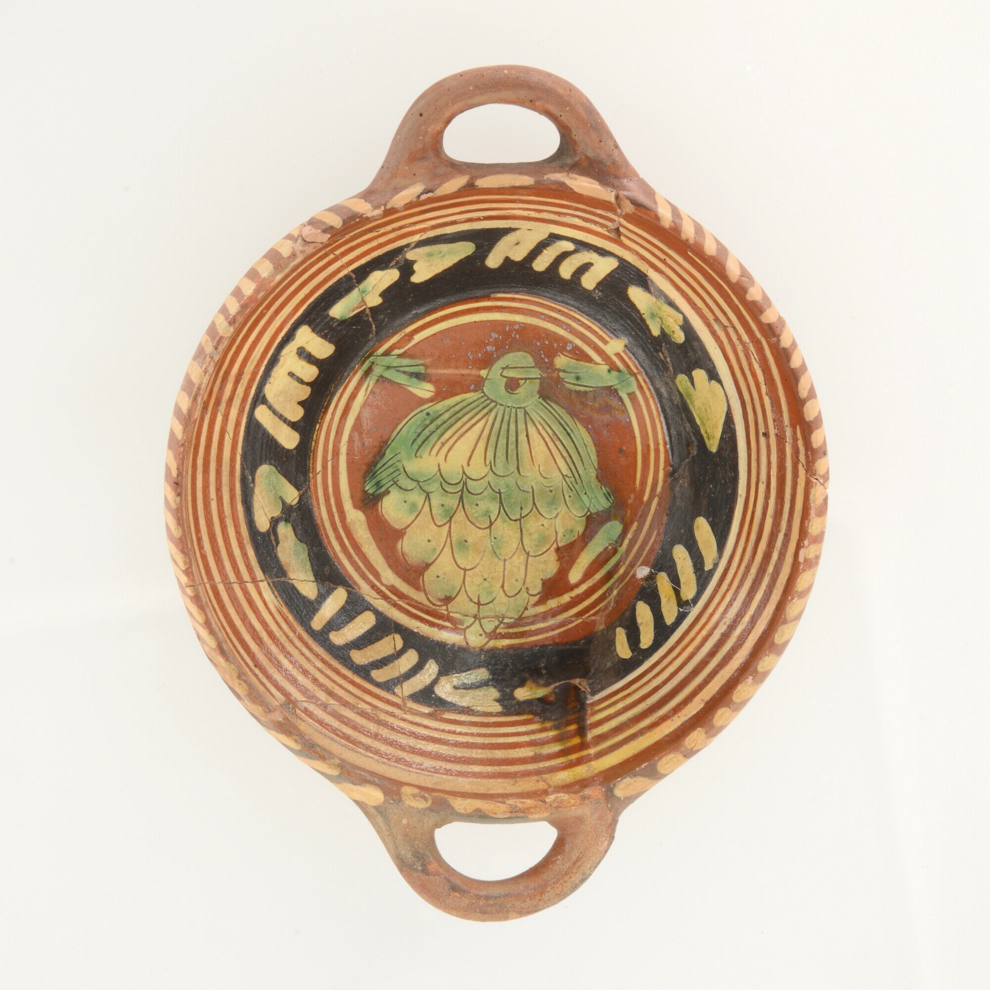 Kom; wa-kom-1; roodbakkend; loodglazuur; slibversiering, slib-krastechniek; vl: concentrische cirkels en baan bladwerk, sp: druiventros; standvlak; twee horizontale worstoren; productieplaats: Enkhuizen