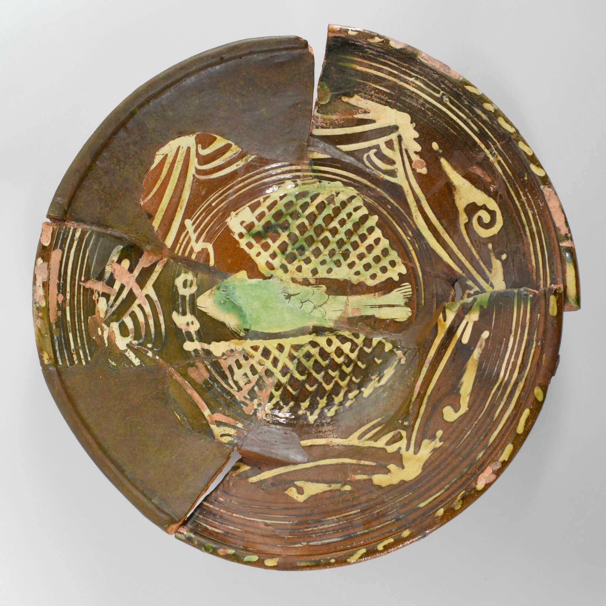 Schotel; wa-bor-1; roodbakkend; verbrand; loodglazuur; slibversiering, slib-krastechniek; vl: concentrische cirkels, ornamentbanden, sp: vis, geometrische motieven en jaartal 1605; standvlak; productieplaats: Enkhuizen
