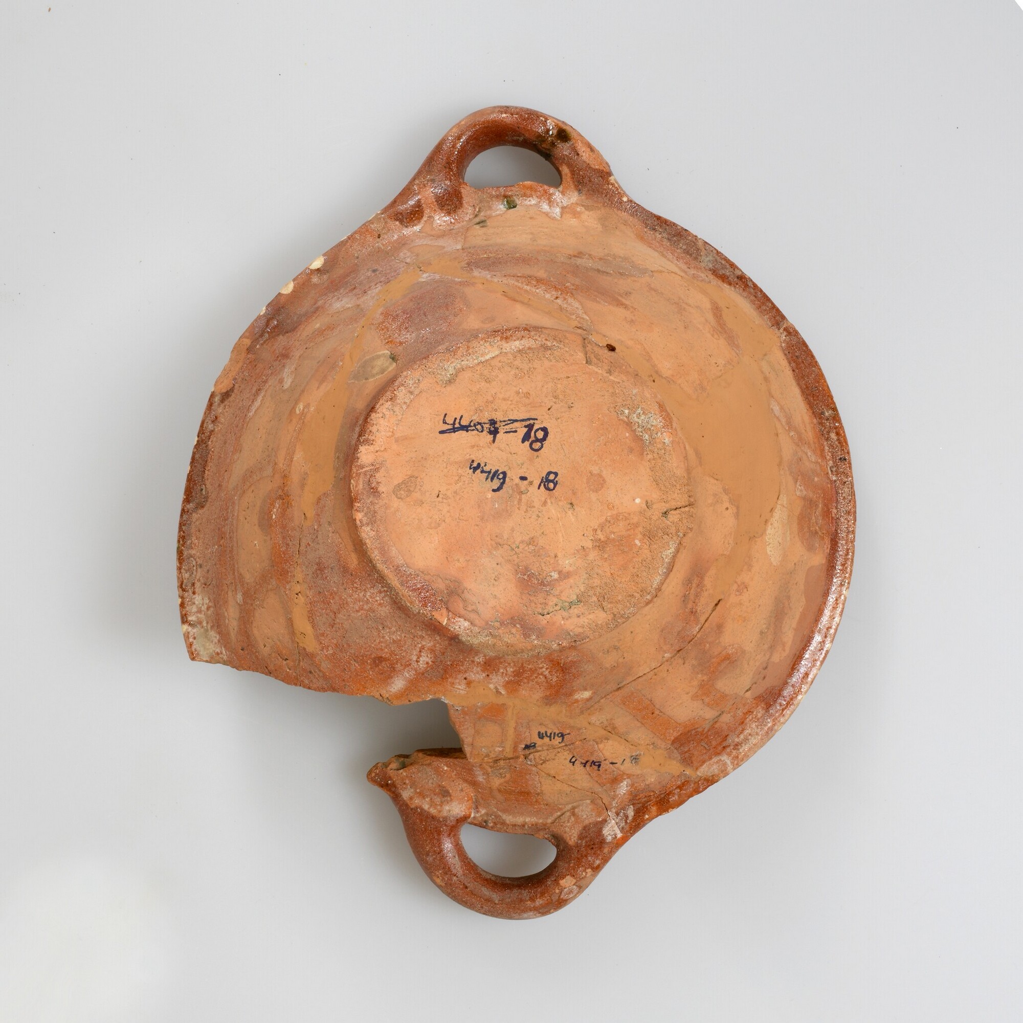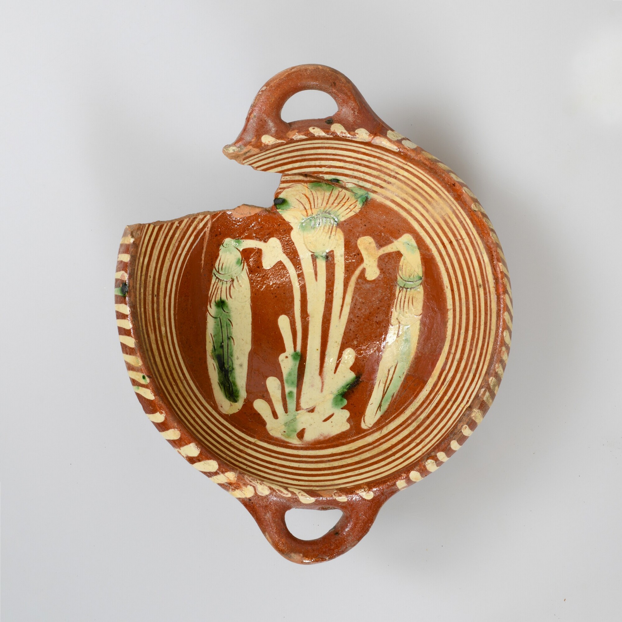 Kom; wa-kom-1; roodbakkend; loodglazuur slibversiering, slib-krastechniek;vl: concentrische cirkels, sp: twee peulen met distel; standvlak; twee horizontale worstoren; productieplaats: Enkhuizen