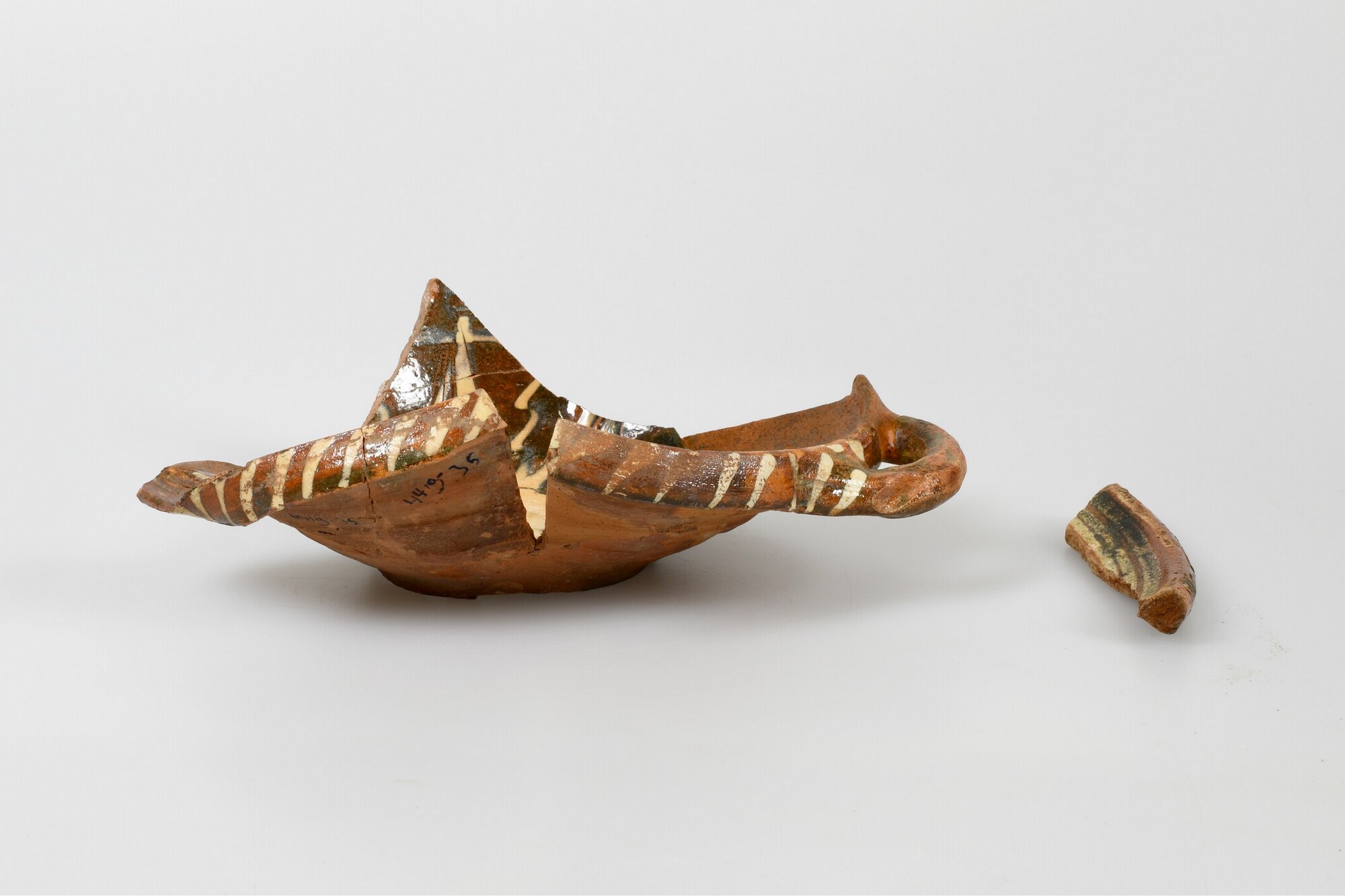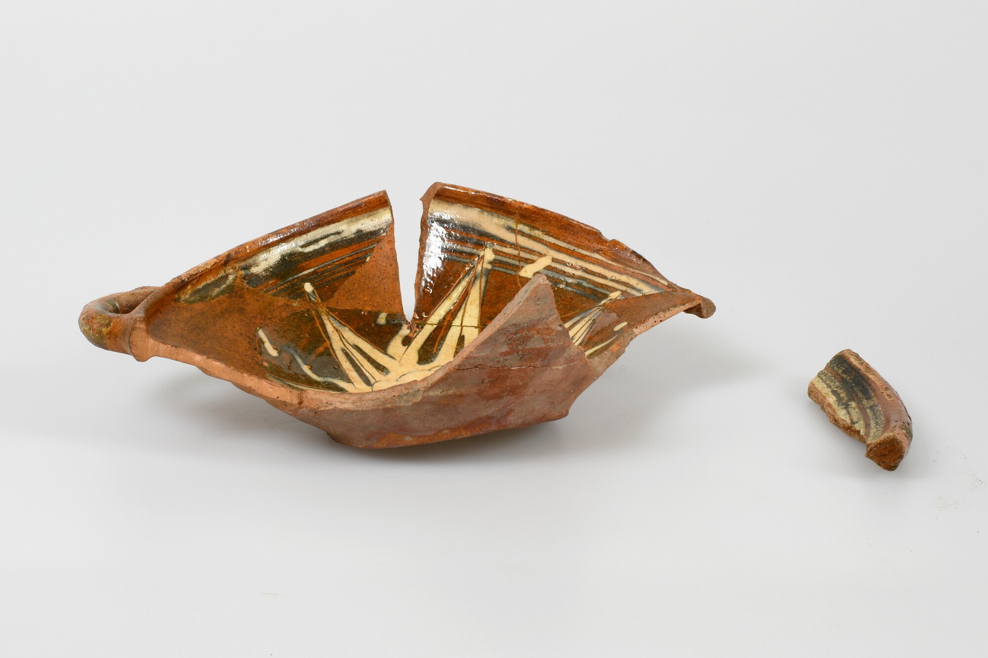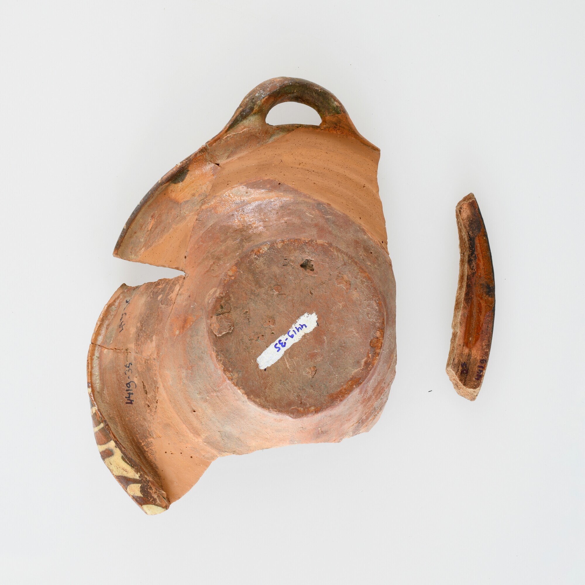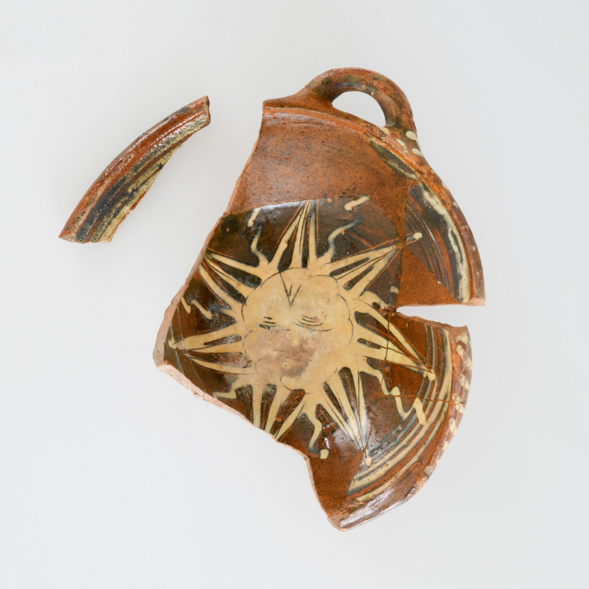 Kom; wa-kom-1; roodbakkend; verbrand; loodglazuur; slibversiering, slib-krastechniek; vl: concentrische cirkels, sp: zevenpuntige zon; standvlak; één horizontaal worstoor; productieplaats: Enkhuizen