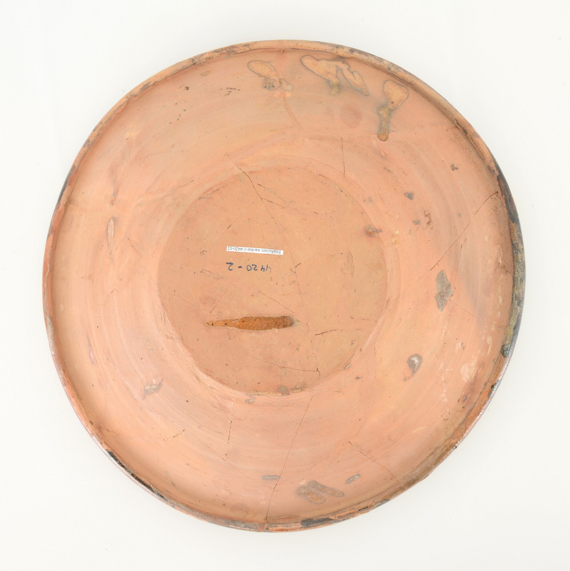 Schotel; wa-bor-1; roodbakkend; verbrand; loodglazuur; slibversiering, slib-krastechniek;vl: concentrische cirkels, ornamentbanden, sp: turkse vrouwenkop(?), initialen DCS en jaartal 1606; standvlak; productieplaats: Enkhuizen