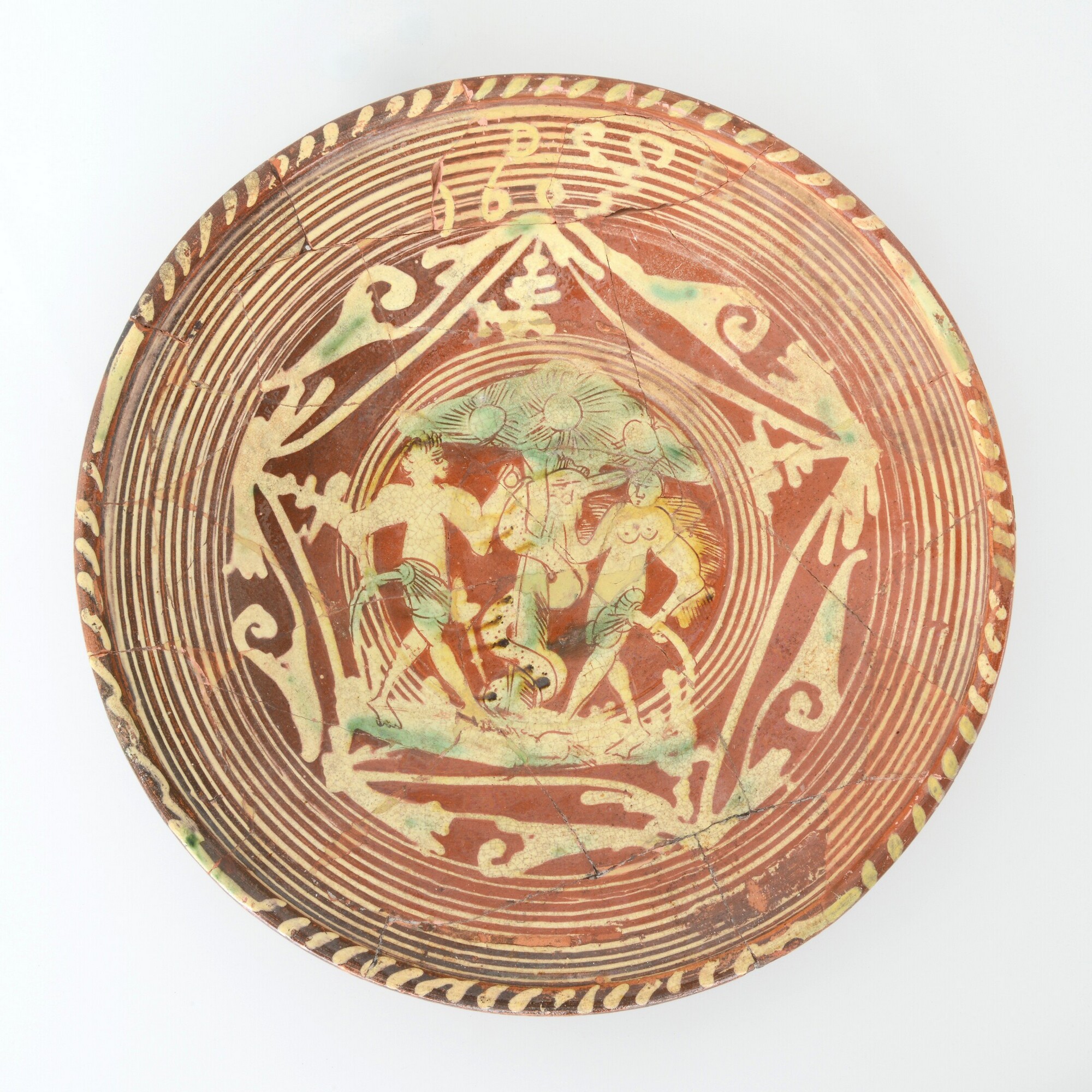 Schotel; wa-bor-1; roodbakkend, vl: concentrische cirkels, initialen DCS en jaartal 1605, ornamentbanden, sp: Adam en Eva; standvlak; productieplaats: Enkhuizen
