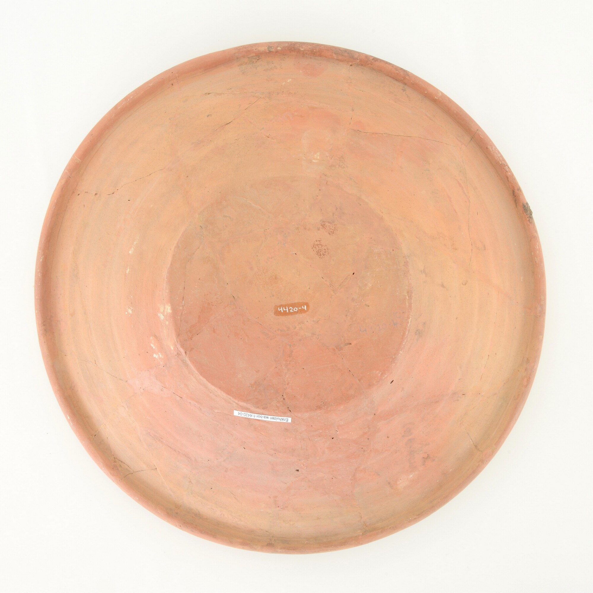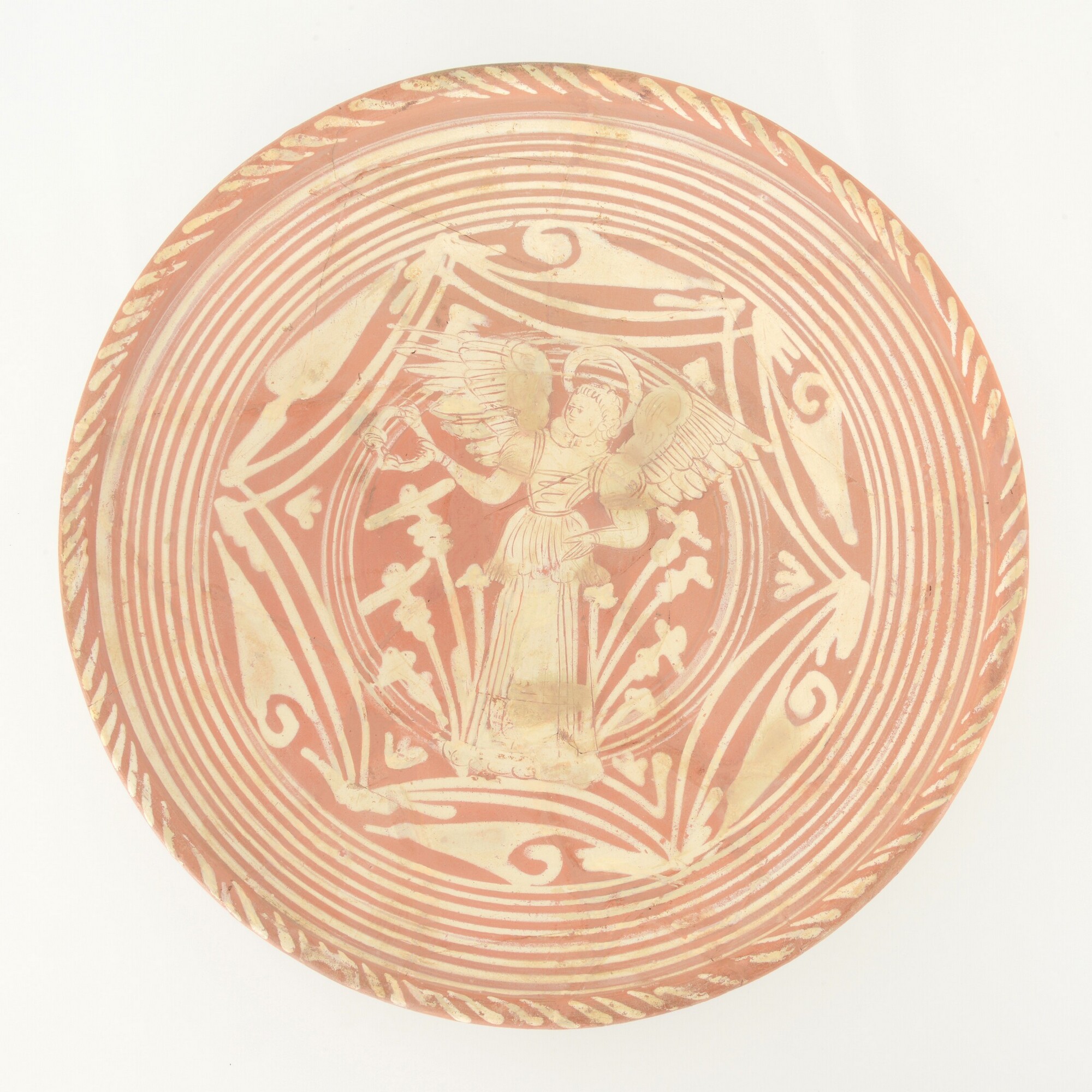 Schotel; wa-bor-1; roodbakkend; halffabricaat, biscuit; slibversiering, slib-krastechniek; vl; concentrische cirkels, ornamentbanden, sp: engel met krans of tamboerijn; standvlak; productieplaats: Enkhuizen