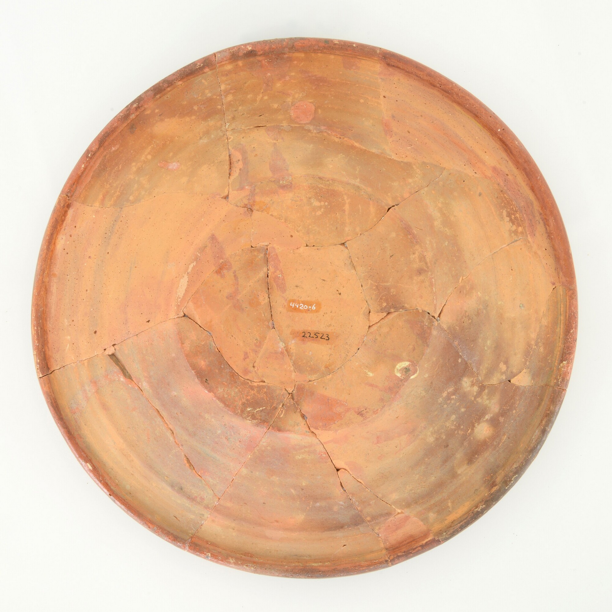 Schotel; wa-bor-1; roodbakkend, verbrand; loodglazuur, slibversiering; slib-krastechniek; vl: concentrische cirkels, ornamentbanden, sp: vrouwenhoofd en jaartal 1605; standvlak; productieplaats: Enkhuizen