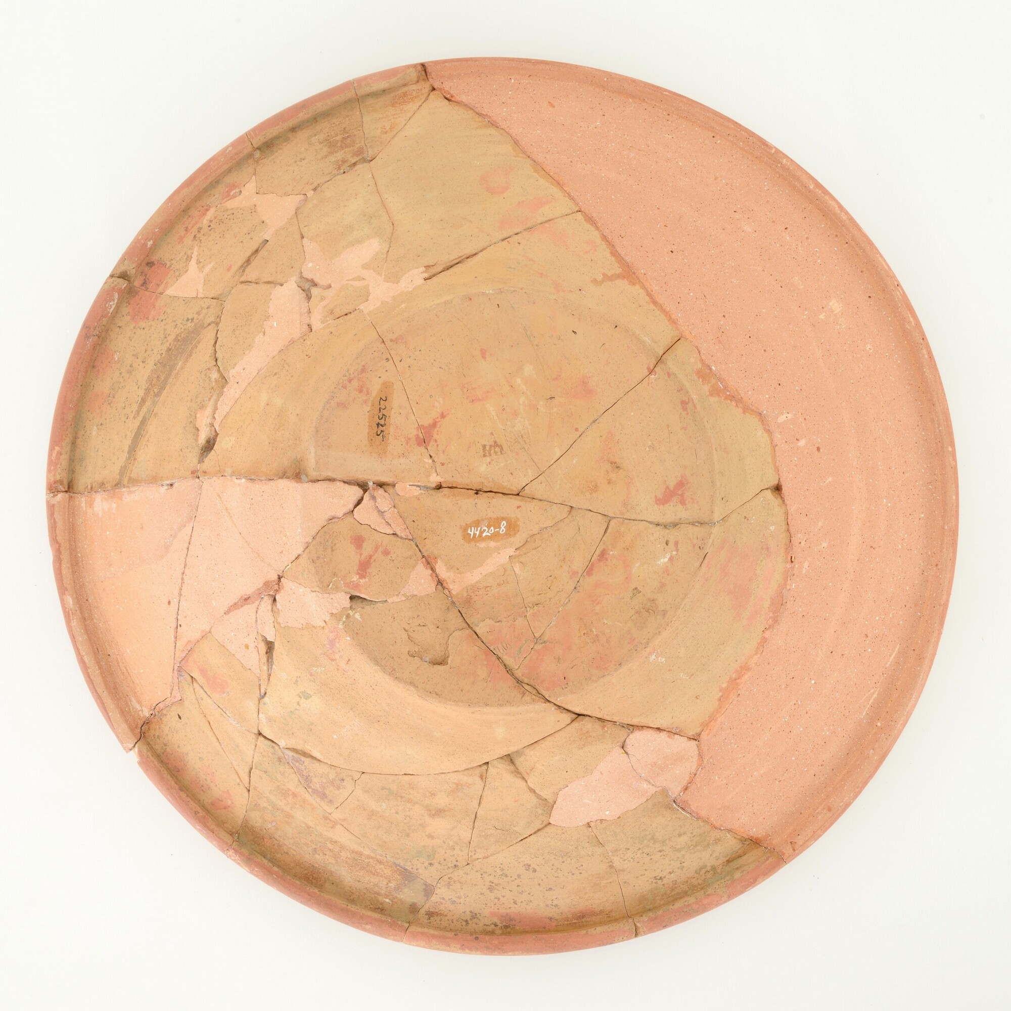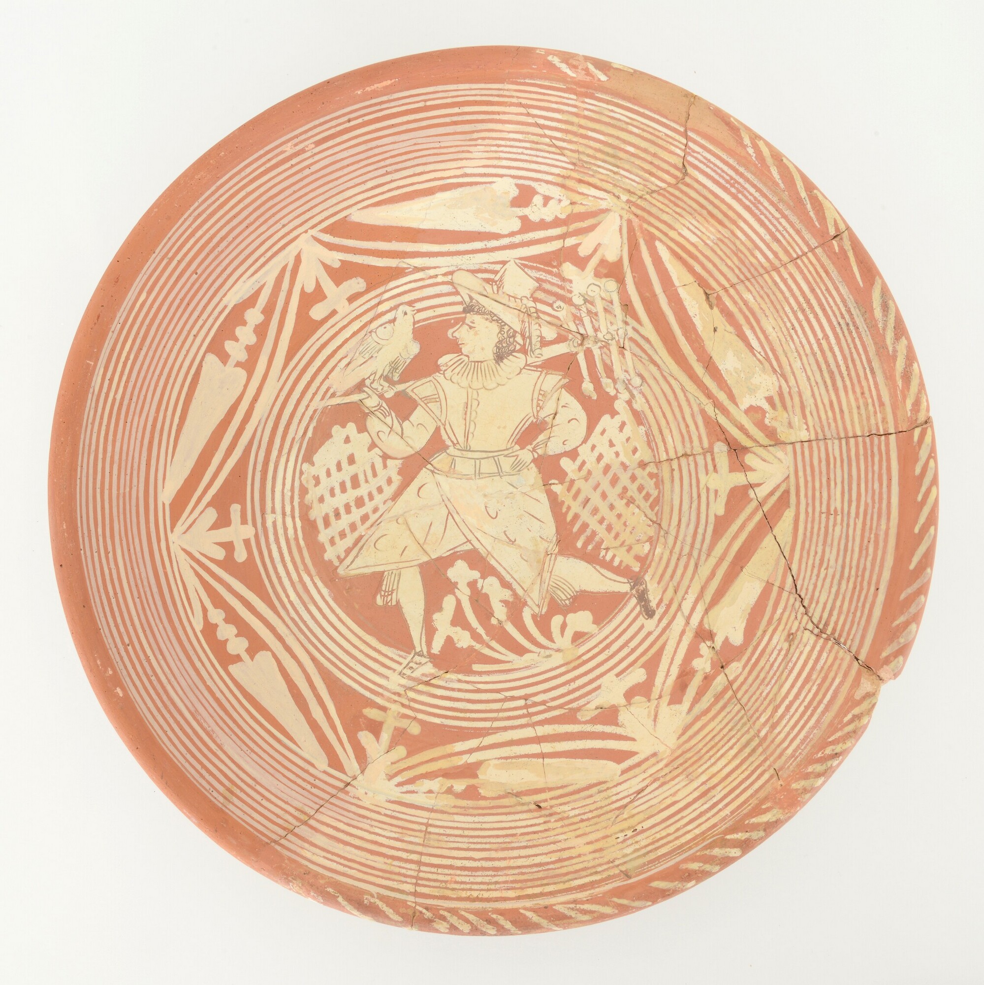 Schotel; wa-bor-1; roodbakkend; halffabricaat, biscuit; slibversiering, slib-krastechniek; vl: concentrische cirkels, ornamentbanden, sp: vogelvanger met lijmstok; standvlak; productieplaats: Enkhuizen