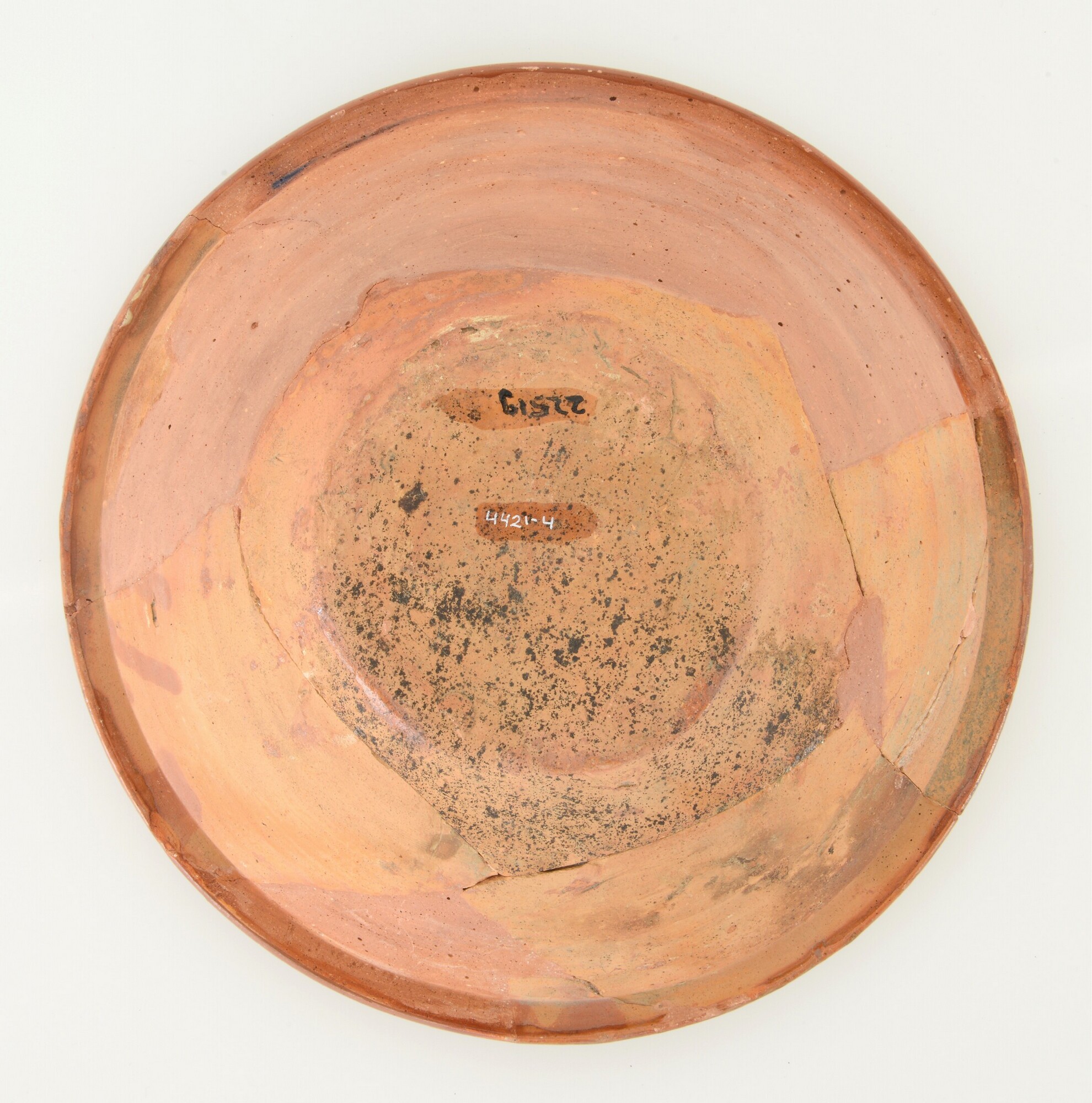 Kom; wa-kom-2; roodbakkend; loodglazuur; slib-krastechniek; vl: concentrische cirkels, ornamentbanden, sp: dierenbuste; standvlak; productieplaats: Enkhuizen