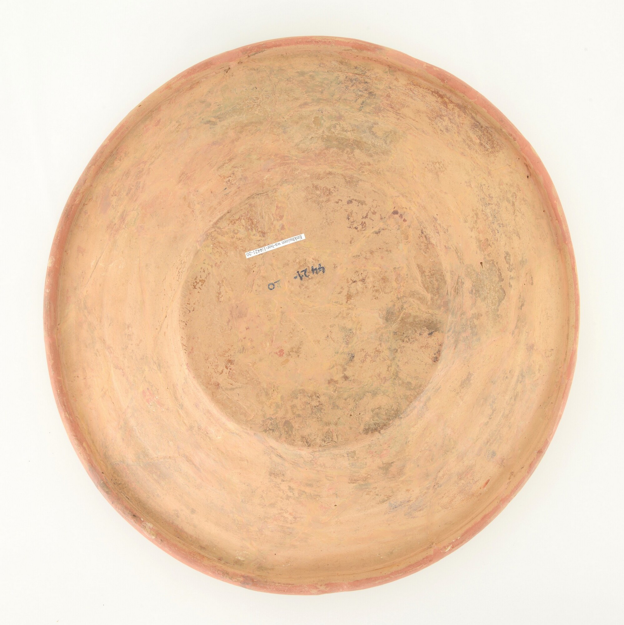 Schotel; wa-bor-1; roodbakkend; halffabricaat, biscuit; slibversiering, slib-krastechniek; vl: concentrische cirkels, ornamentbanden, sp: jongeman met kelk, initialen DCS en jaartal 1605; standvlak; productieplaats: Enkhuizen
