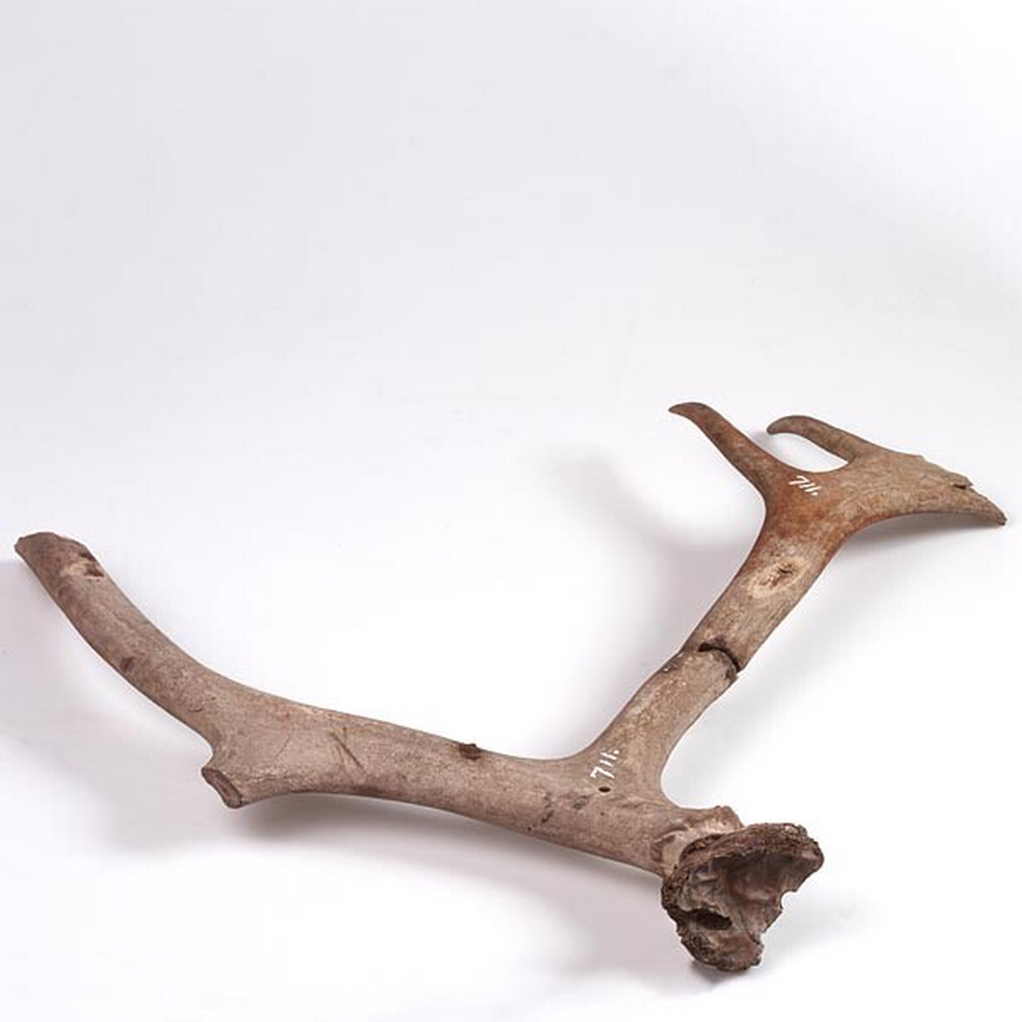 Gewei; edelhert, twee stangen zijn afgezaagd, geboord gat, vijf doorboorde gaten waarvan er drie zijn opgevuld met spijkers, de tweede zijtak, de zgn. ijstak, is afgebroken op de plaats waar eveneens is geboord; de eerste en derde zijtak (resp. oogtak en middentak) zijn afgezaagd, vondstdatum: 09-07-1934
