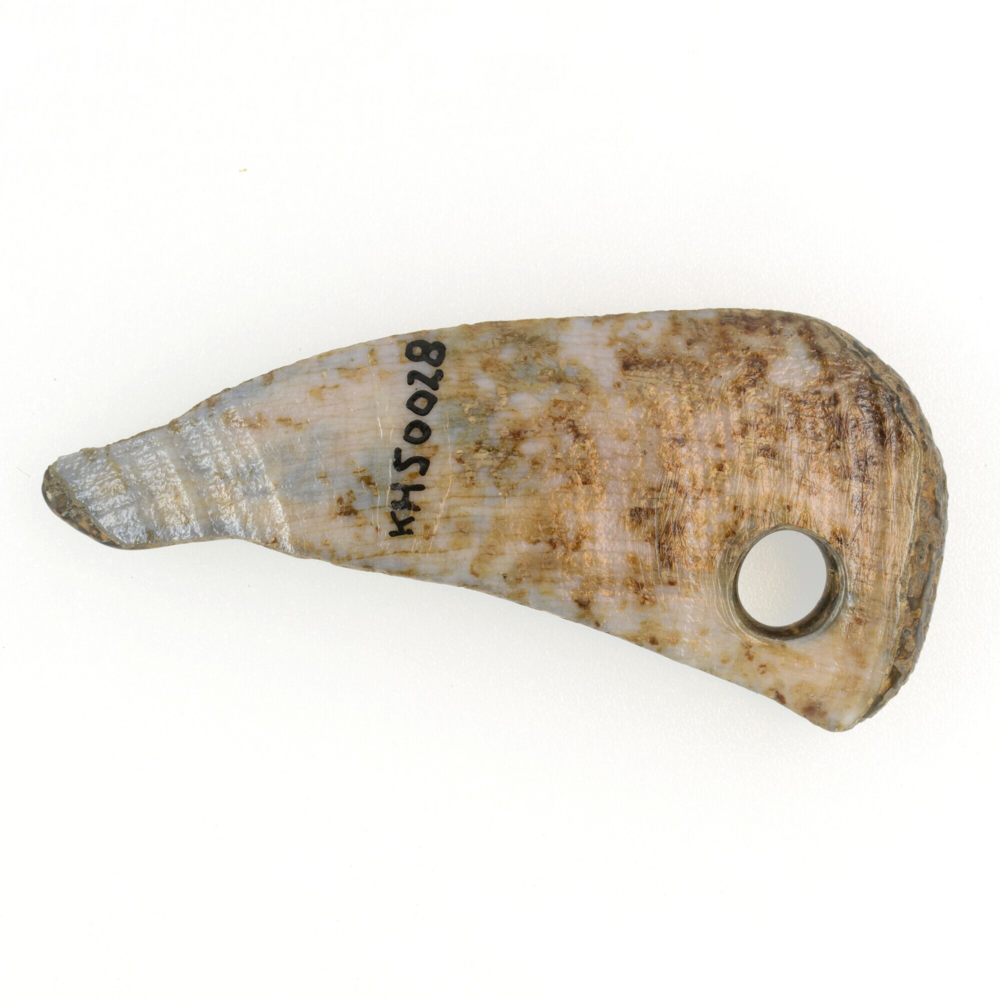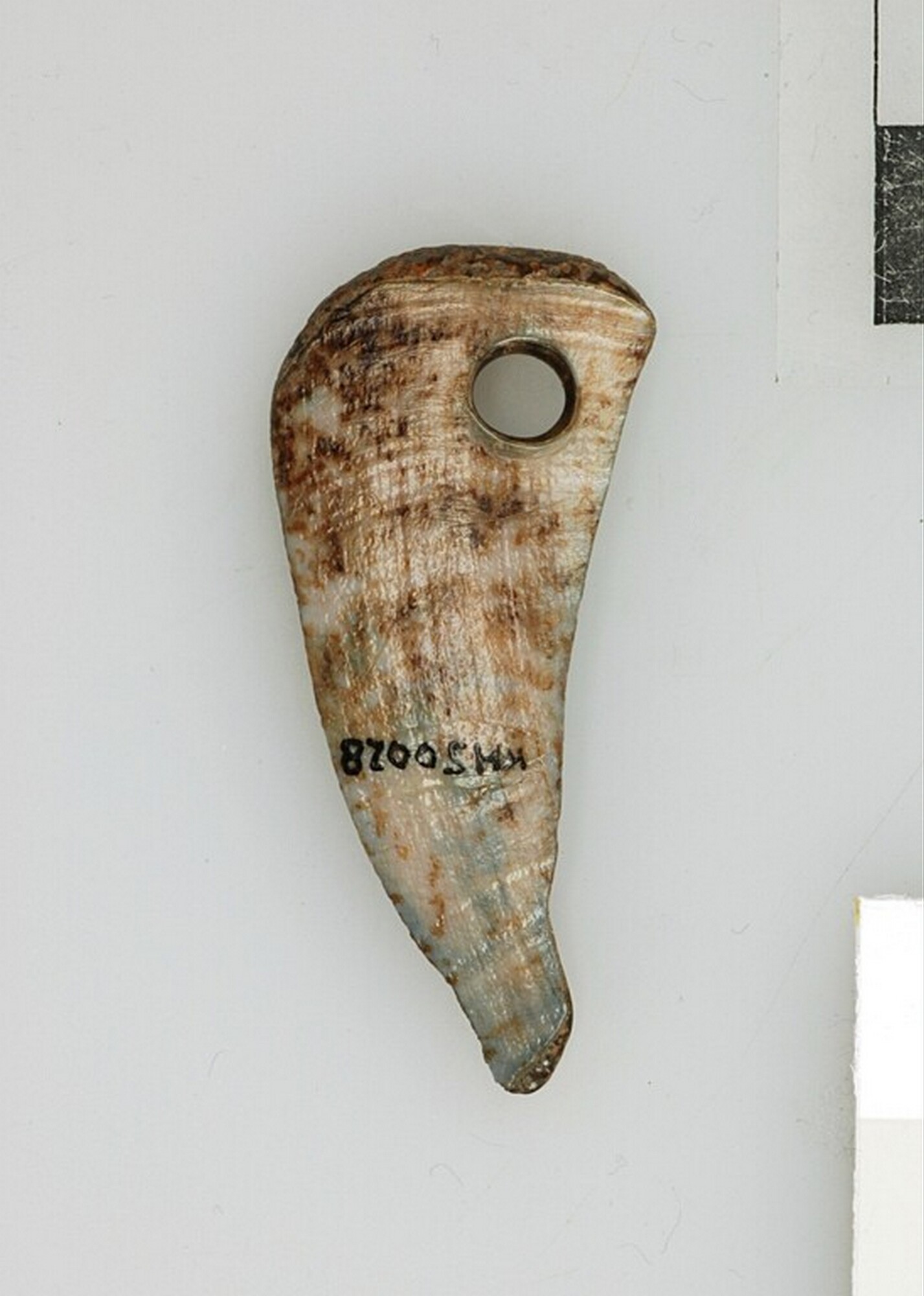 Hanger; vervaardigd uit een tand; vondstgegevens: KH80, KH50028, laag BV, coördinaten:145.50/26.50