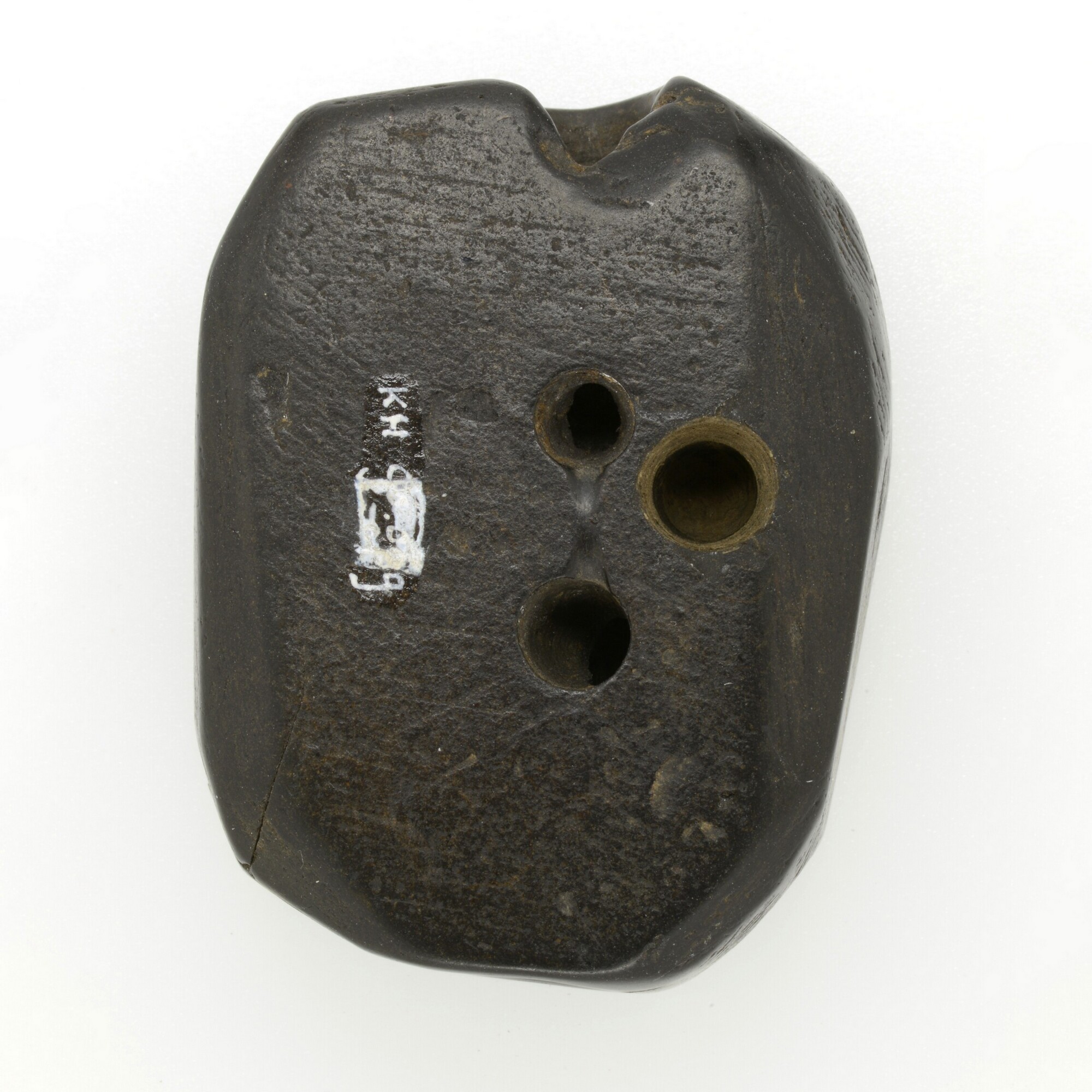 Sluitstuk van een ketting; rechthoekig stuk met vijf doorboringen; vondstgegevens: laag2, KB90009 en KB90010, coördinaten: 215.00/38.00