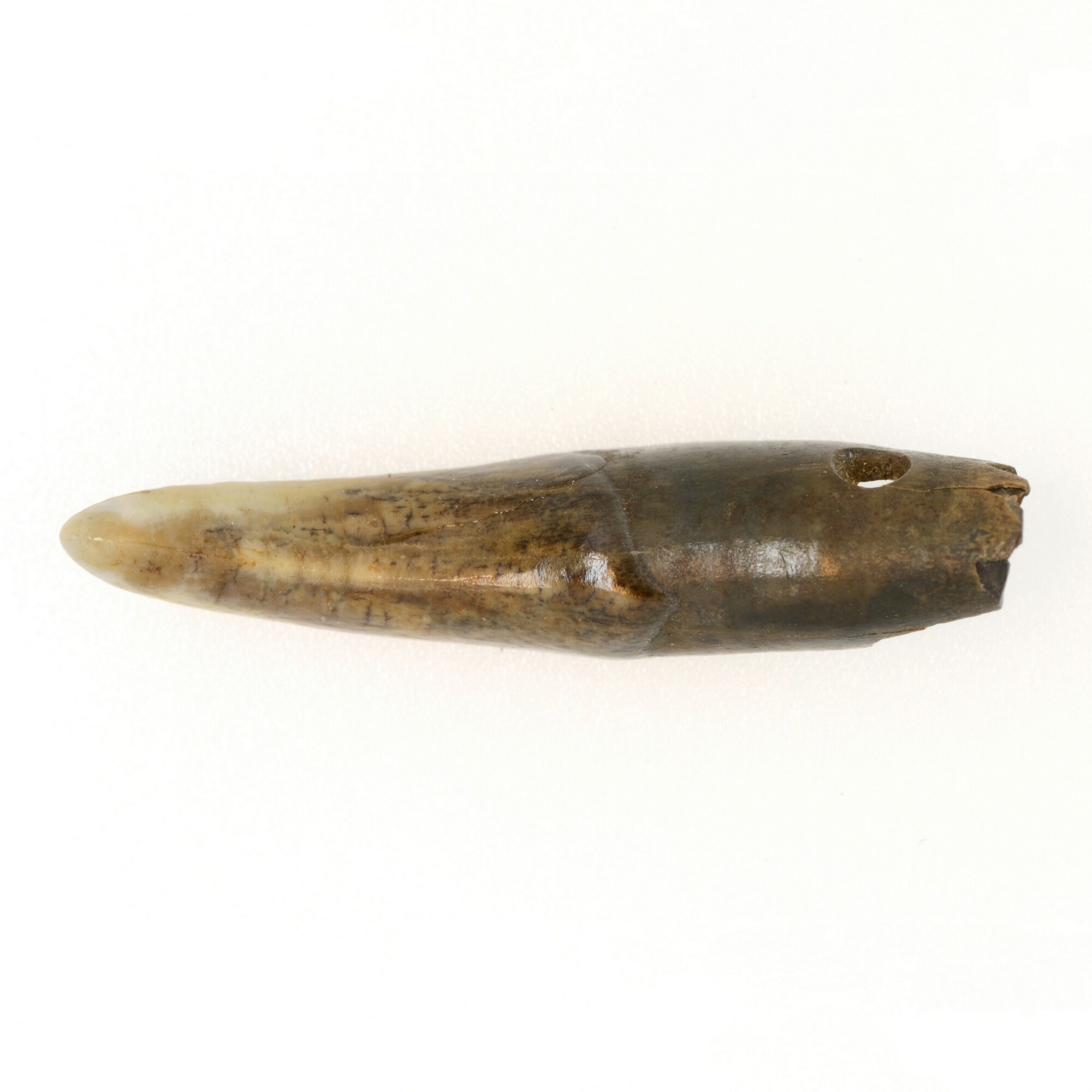 Hanger; vervaardigd uit de tand van een wolf (?); vondstgegevens: laag I, coordinaten: 157.5/42.5, vondstjaar: 1986
