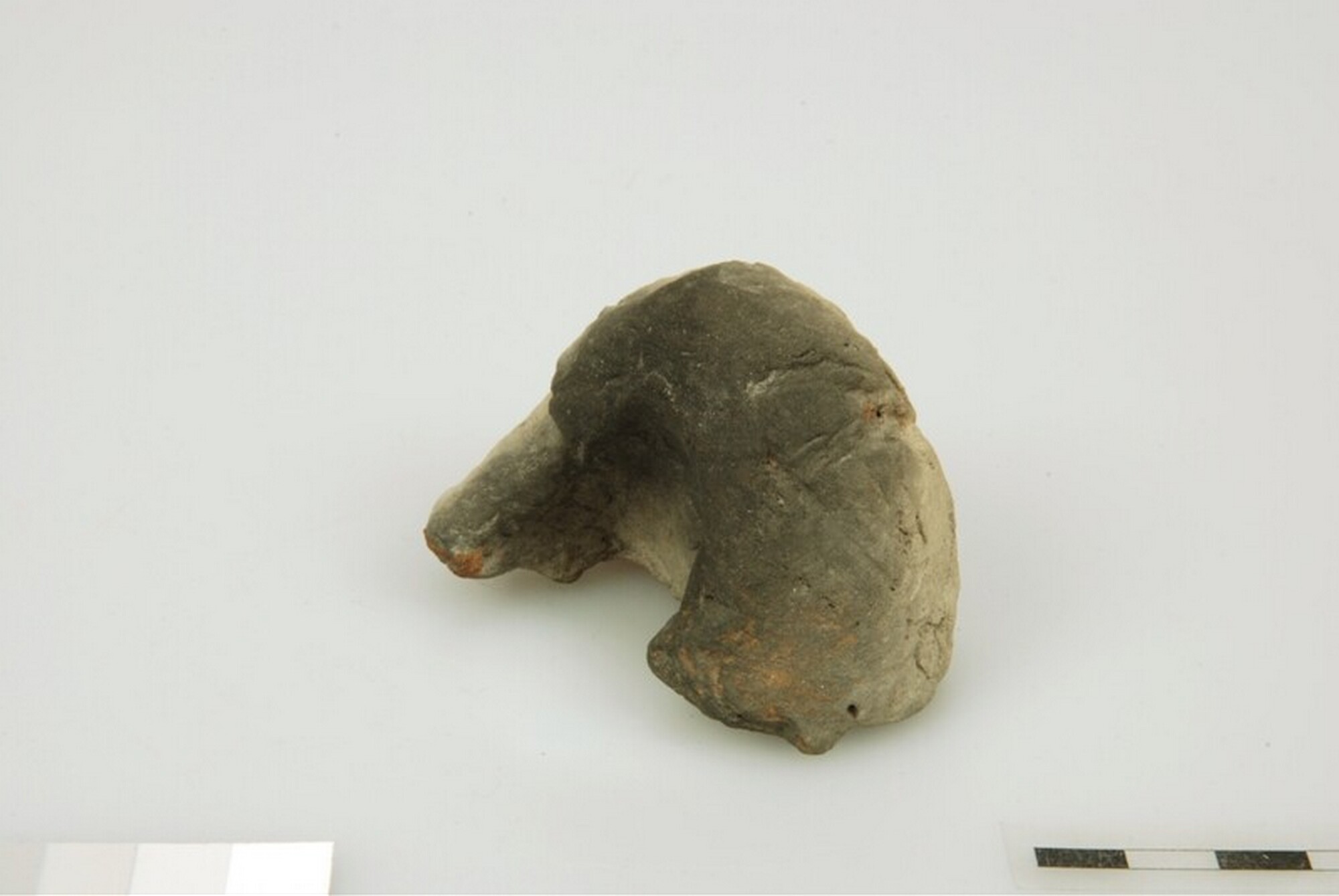 Schijf; inheems-Romeins aardewerk; ovaal, duimindrukken, beroet