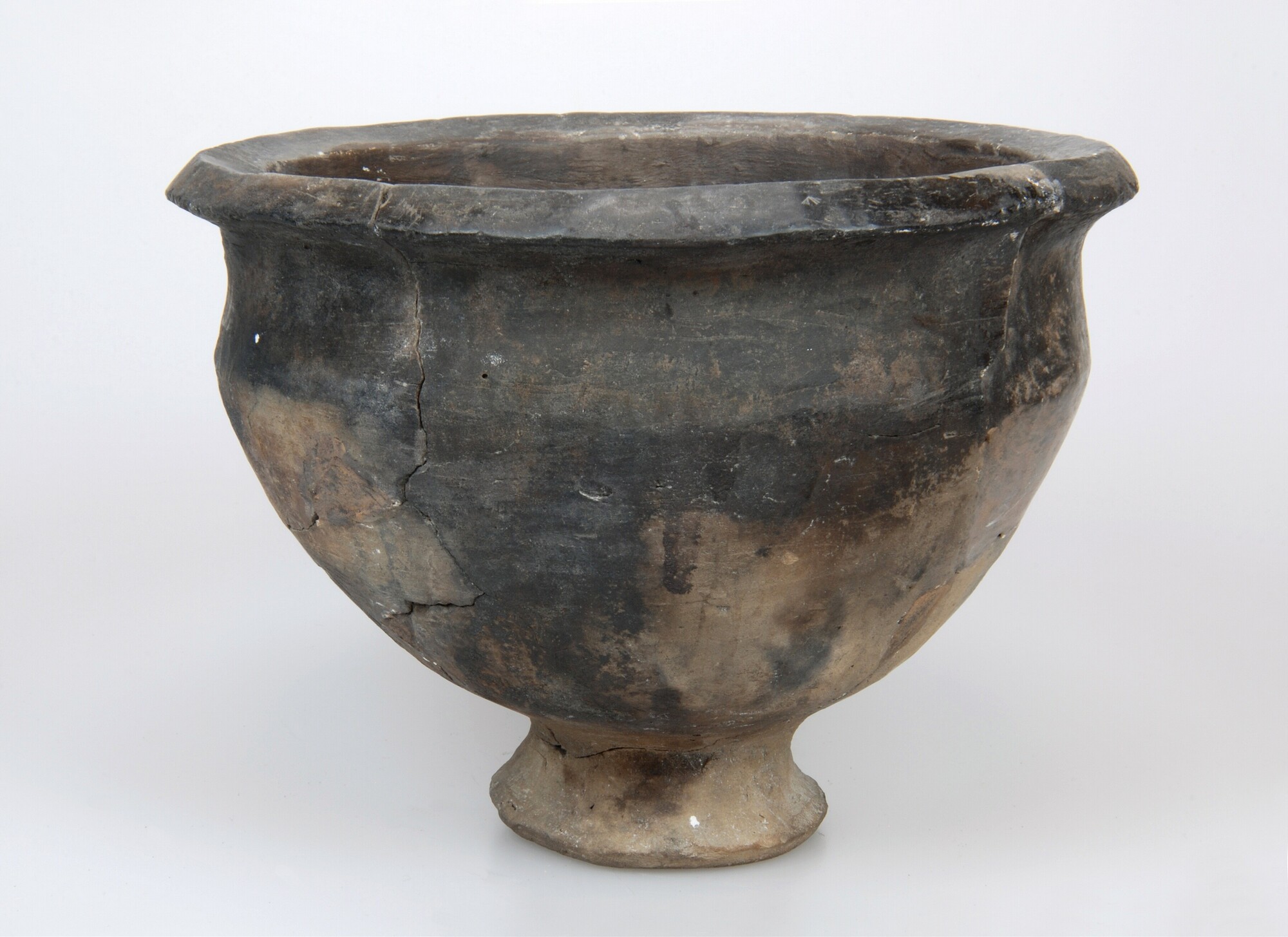 Kelk/situla; type Diederik F-V; inheems-Romeins aardewerk; wijdmondige bolle pot (situla/kelk) op hoge, uitgeholde standvoet; meervoudig gefacetteerde A-rand; gepolijst oppervlak