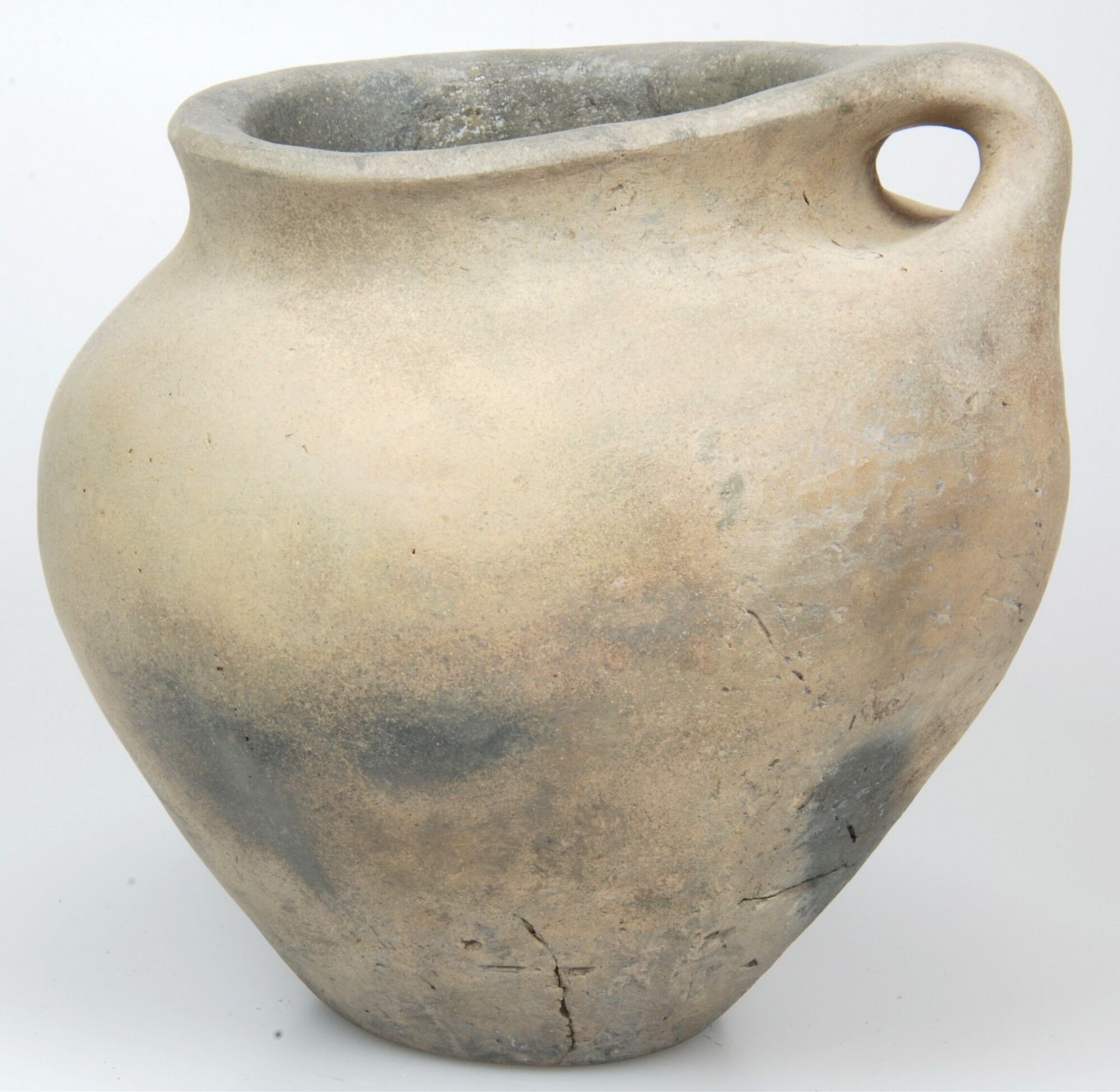 Pot; type Westergo K3b (?); inheems aardewerk; nauwmondige pot met onversierde, gladde rand; één rond (gereconstrueerd) oor; standvlak; organische magering