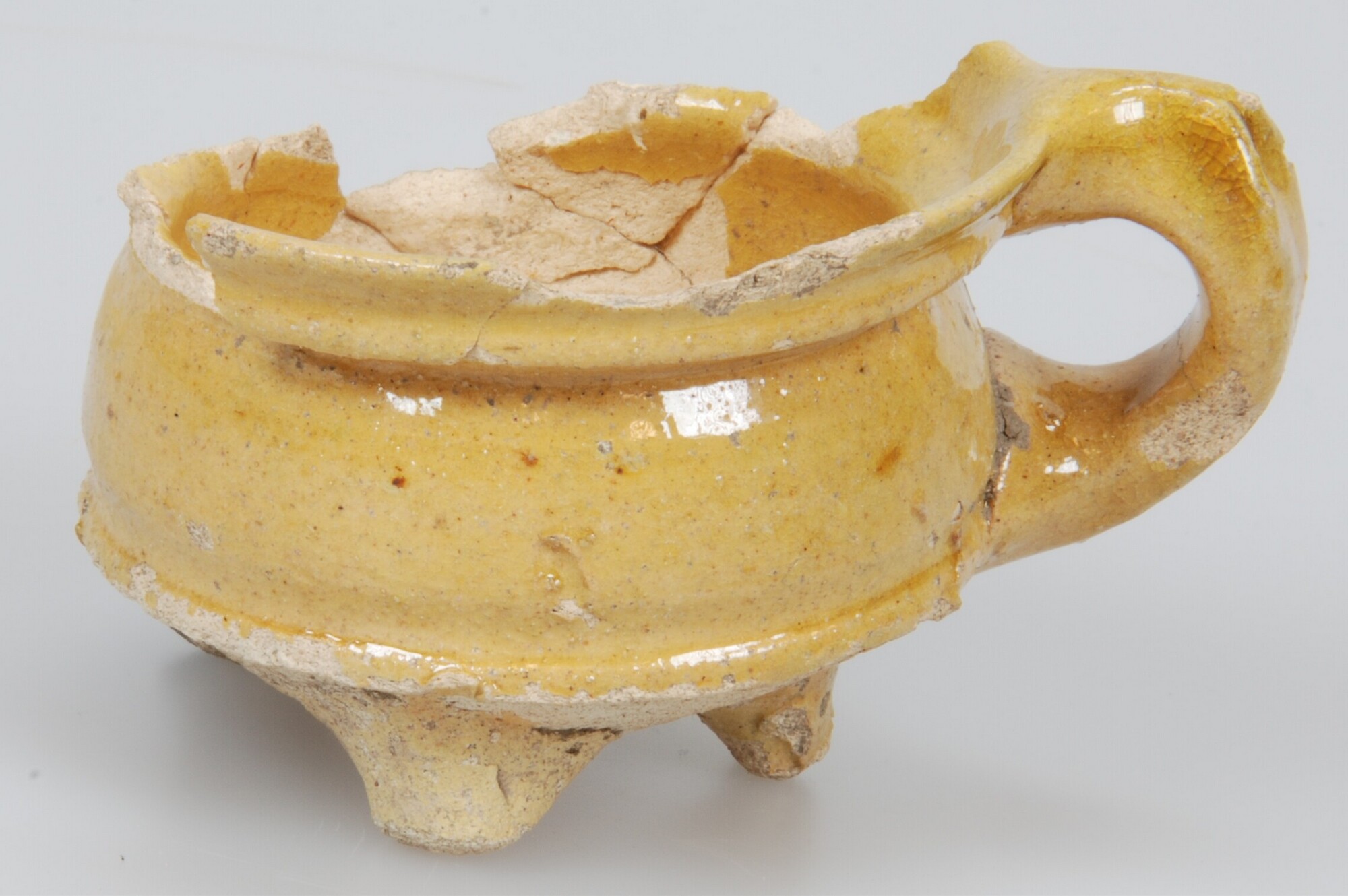 Grape (miniatuur); w-min; wijde grape met scherpe buikknik en kraagrand met dekselgeul ( w-gra-10); witbakkend aardewerk; loodglazuur; drie poten; samengeknepen lintoor; vrijwel compleet; herkomst: lokaal of in de regio vervaardigd)