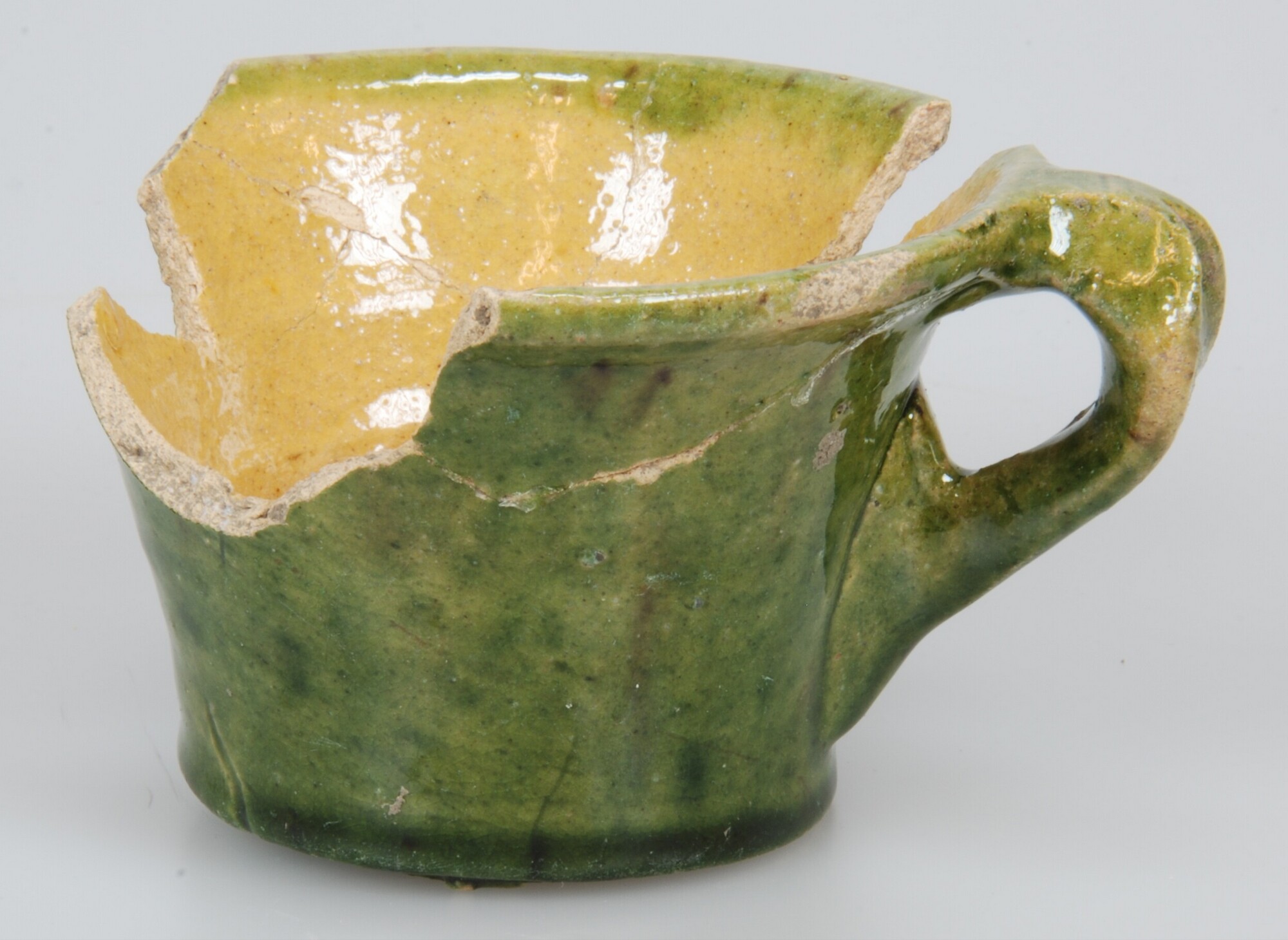 Kop; w-kop-3; conische kop met platte bodem; witbakkend aardewerk; loodglazuur, uitwendig met koperoxide; rode aanbaksels binnenzijde bodem; standvlak; samengeknepen lintoor; vrijwel compleet; herkomst: lokaal of in de regio vervaardigd