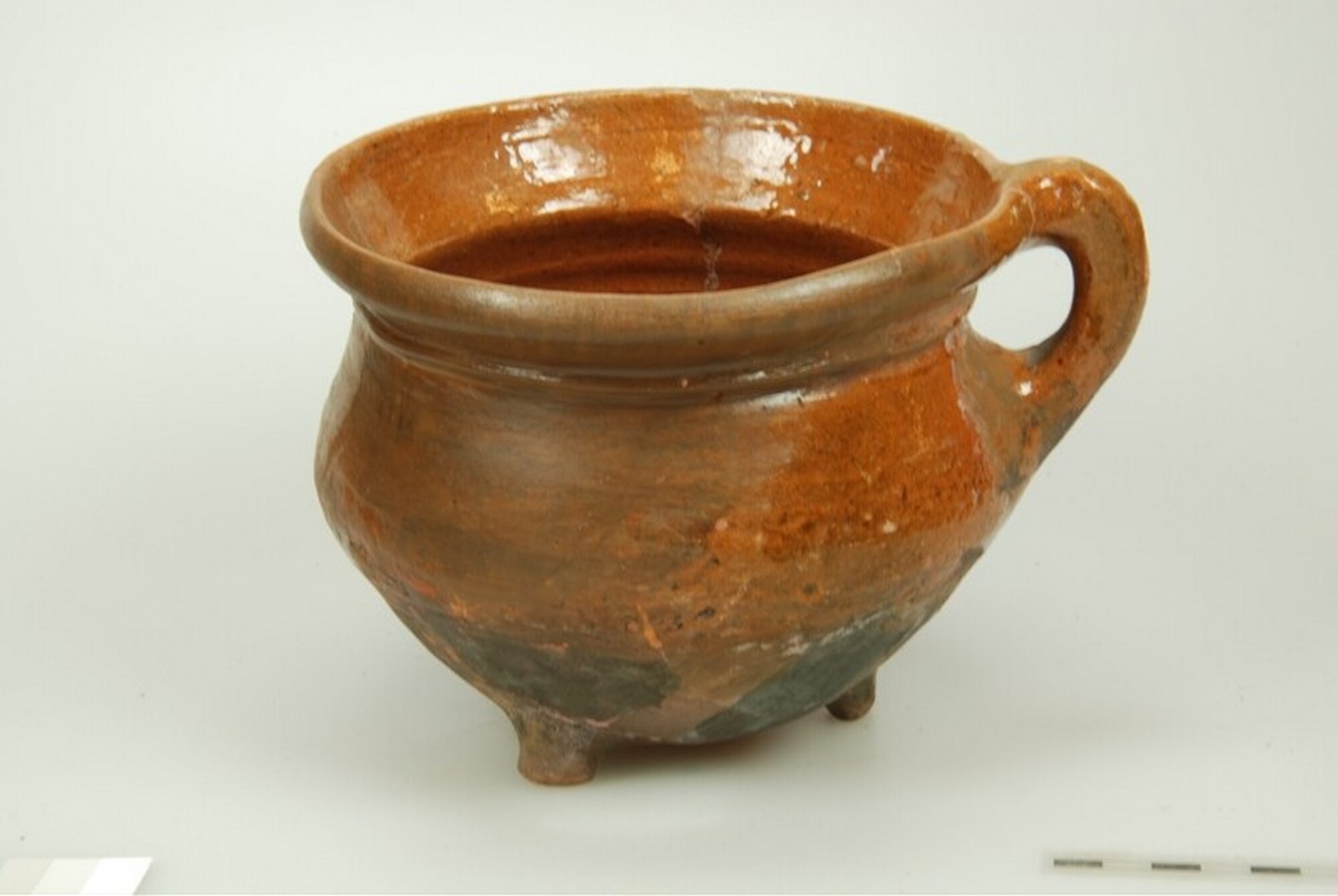 Grape; r-gra-11: roodbakkend; gedraaid; loodglazuur, binnenzijde en buitenzijde geglazuurd; driepoot; één verticaal worstoor; AWP-code: 1991-01-47