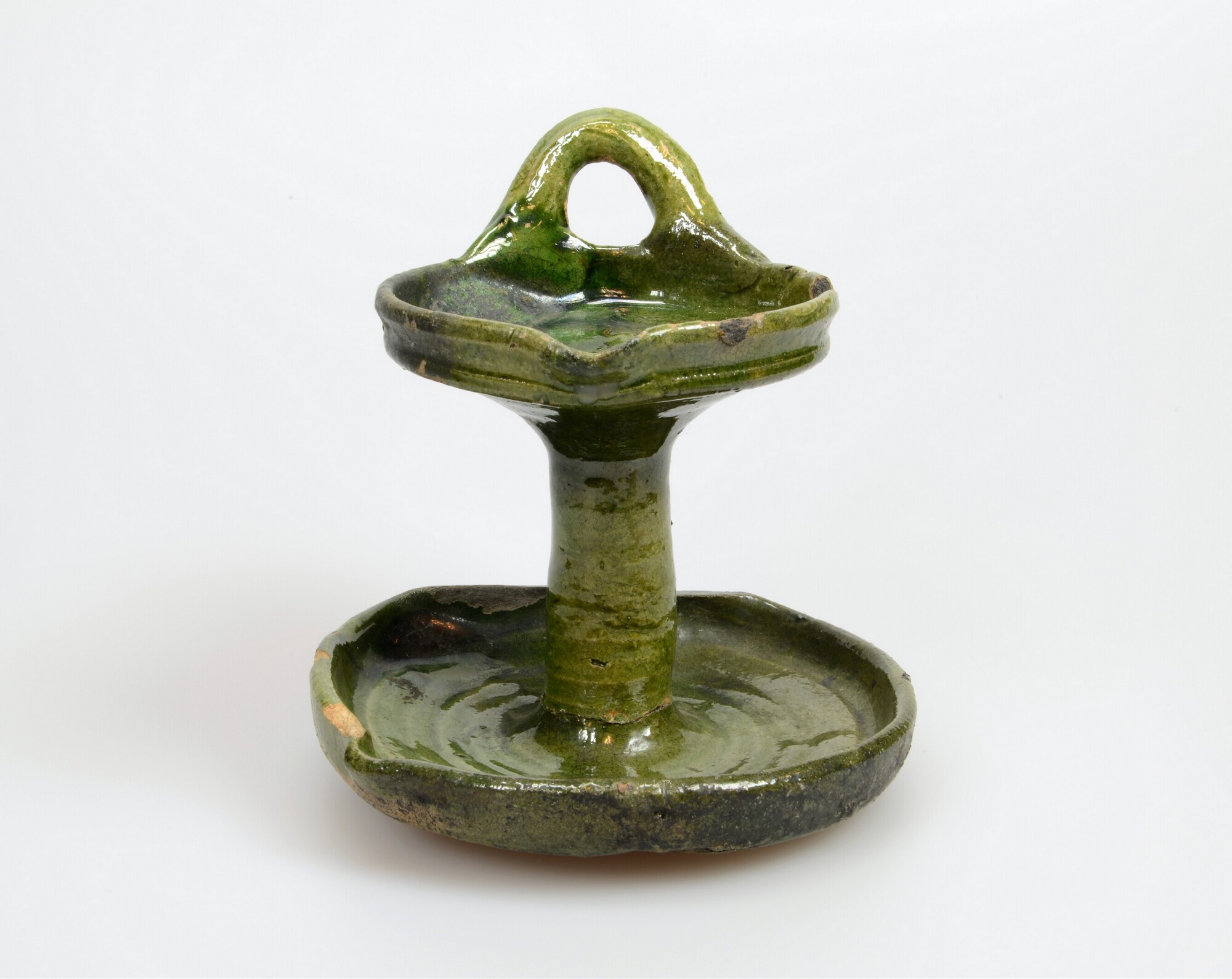 Olielamp; w-oli-2; olielamp met twee schalen en stam, 1 verticaal worstoor, lekschaal afgeplat, geknikte rand; witbakkend aardewerk; loodglazuur, koperoxide; herkomst: Nederland