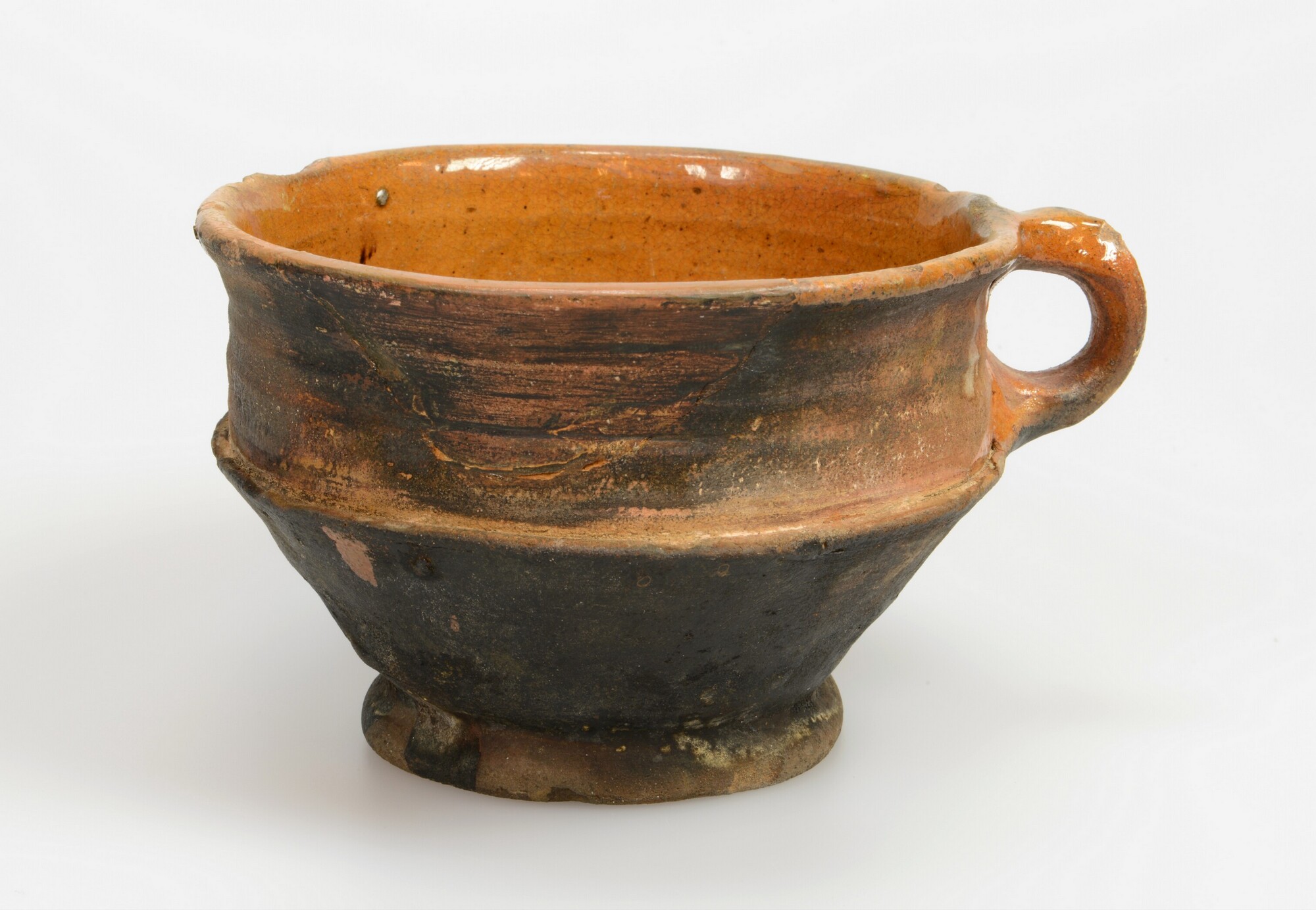 Kop; r-kop-2; kop met scherpe knik bodem-wand en iets uitgebogen wand, verticaal samengeknepen worstoor; standring; roodbakkend aardewerk; inwendig loodglazuur; beroet; herkomst: Nederland