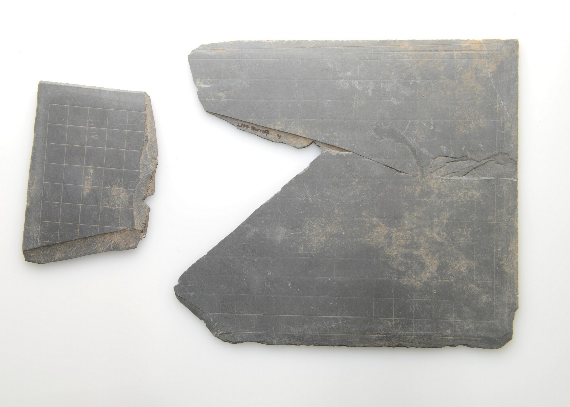 Schrijflei; ingegroefde lijnen die op beide zijden van de lei zijn aangebracht. Op de voorzijde (met afgeschuinde randen) gaat het om een dambordpatroon met vierkanten van circa 1.2 x 1.2 cm. De achterzijde heeft alleen horizontale lijnen met een regelafstand van circa 1.2 cm