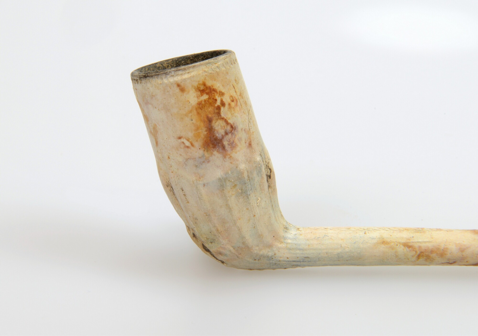 Tabakspijp; rondbodem / ovoïde ketel zonder hiel; ketel gebotterd; radering rond ketelopening; ketelbasis in reliëf knorrenmotief bekroond met een bladmotief; ketel inwendig beroet; herkomst: Gouda