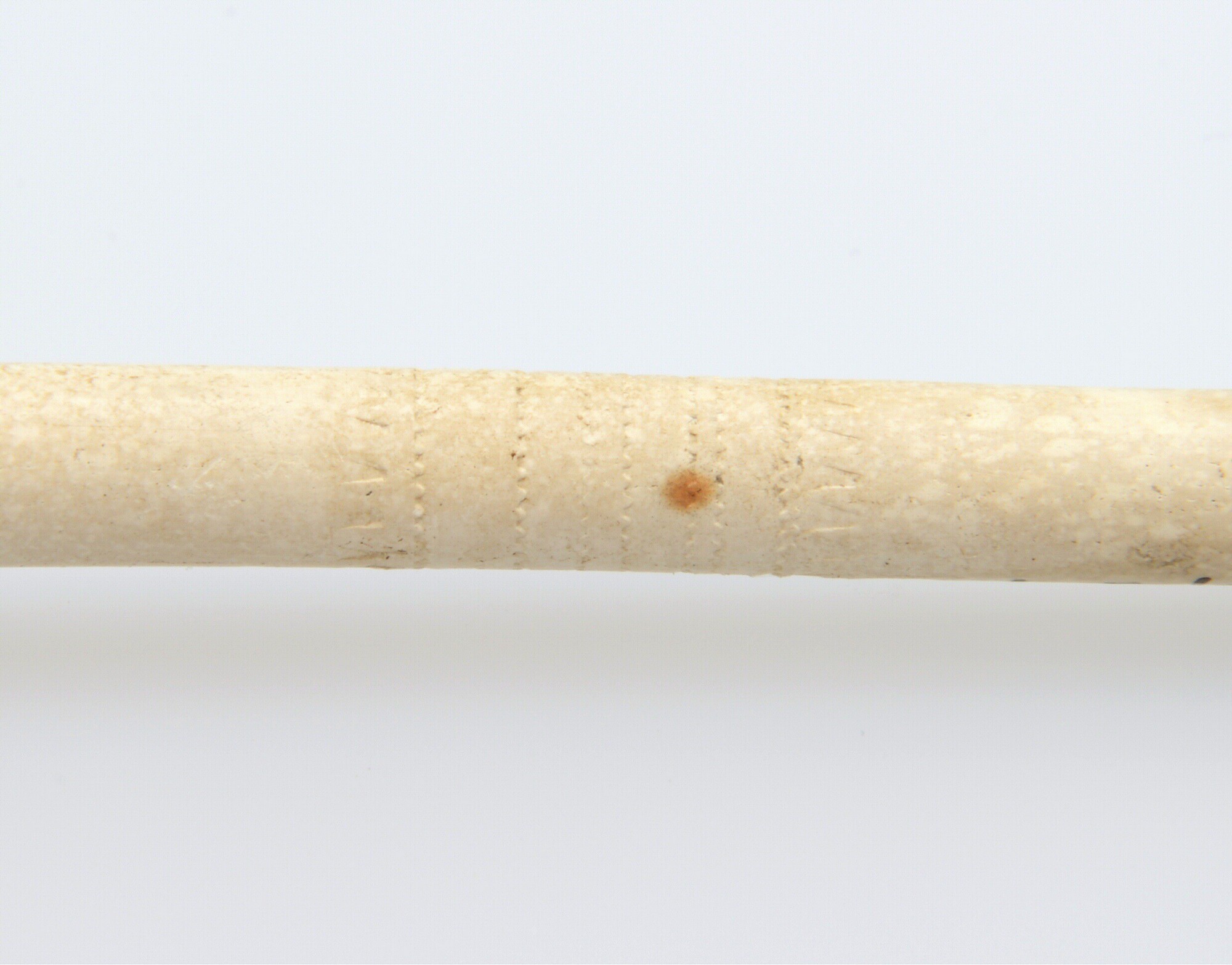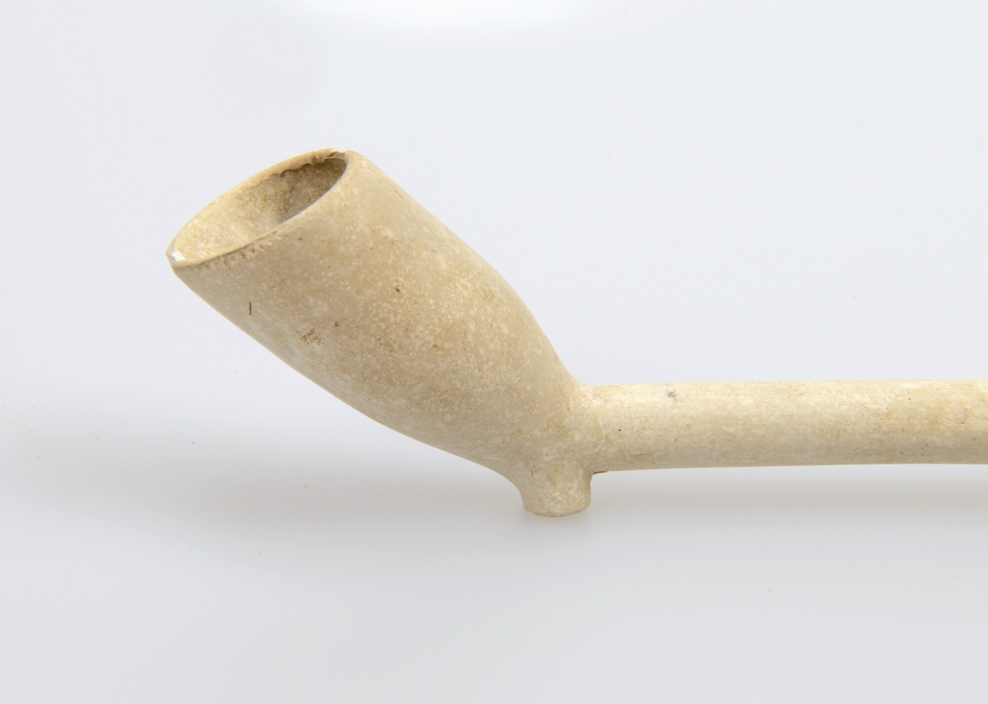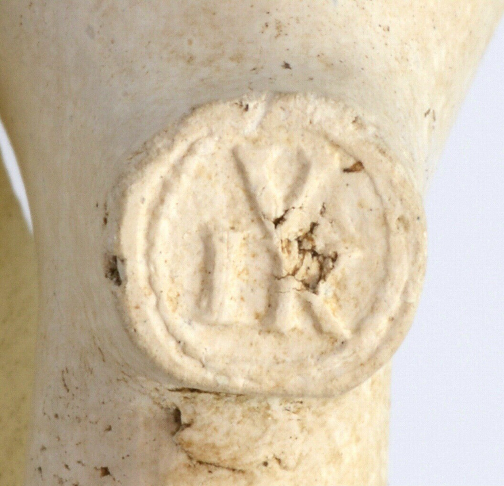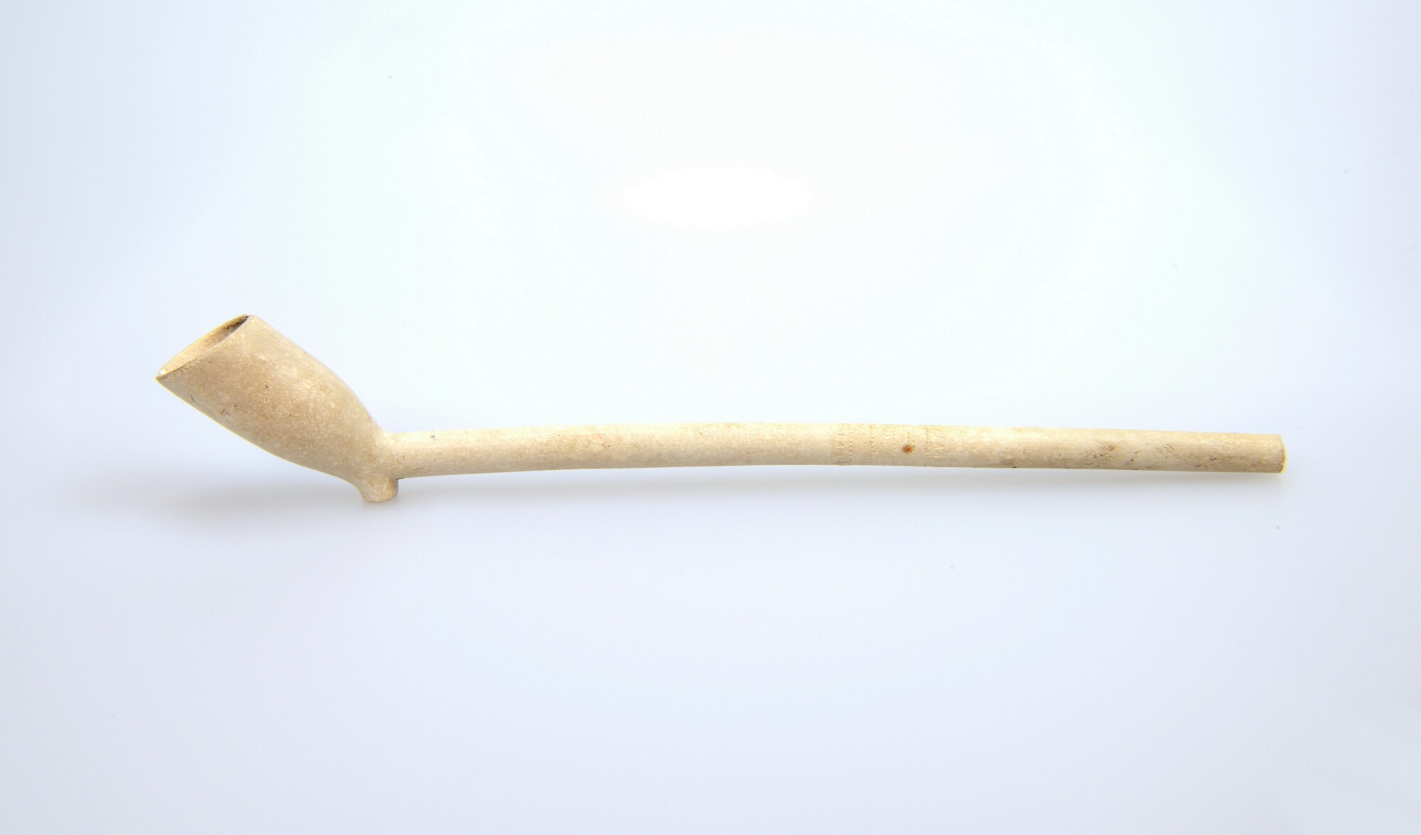 Tabaksspijp; trechtervormige ketel; geglaasd; ketel gebotterd; radering langs ketelopening en steelradering; hielmerk: IVK; herkomst: Gouda; pijpenmaker: Pieter Jacobsz. van Kleef