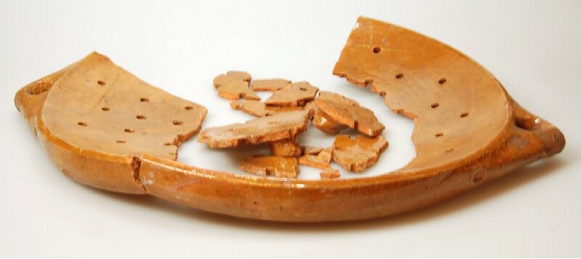 Lekschaal; r-lek-1; roodbakkend; gedraaid; loodglazuur, binnen- en buitenzijde; driepoot; twee horizontale worstoren; Nederland