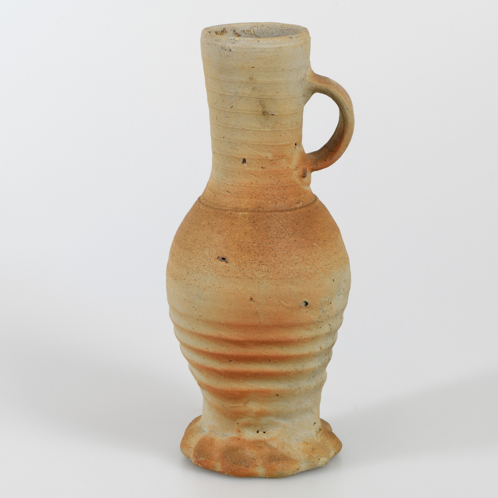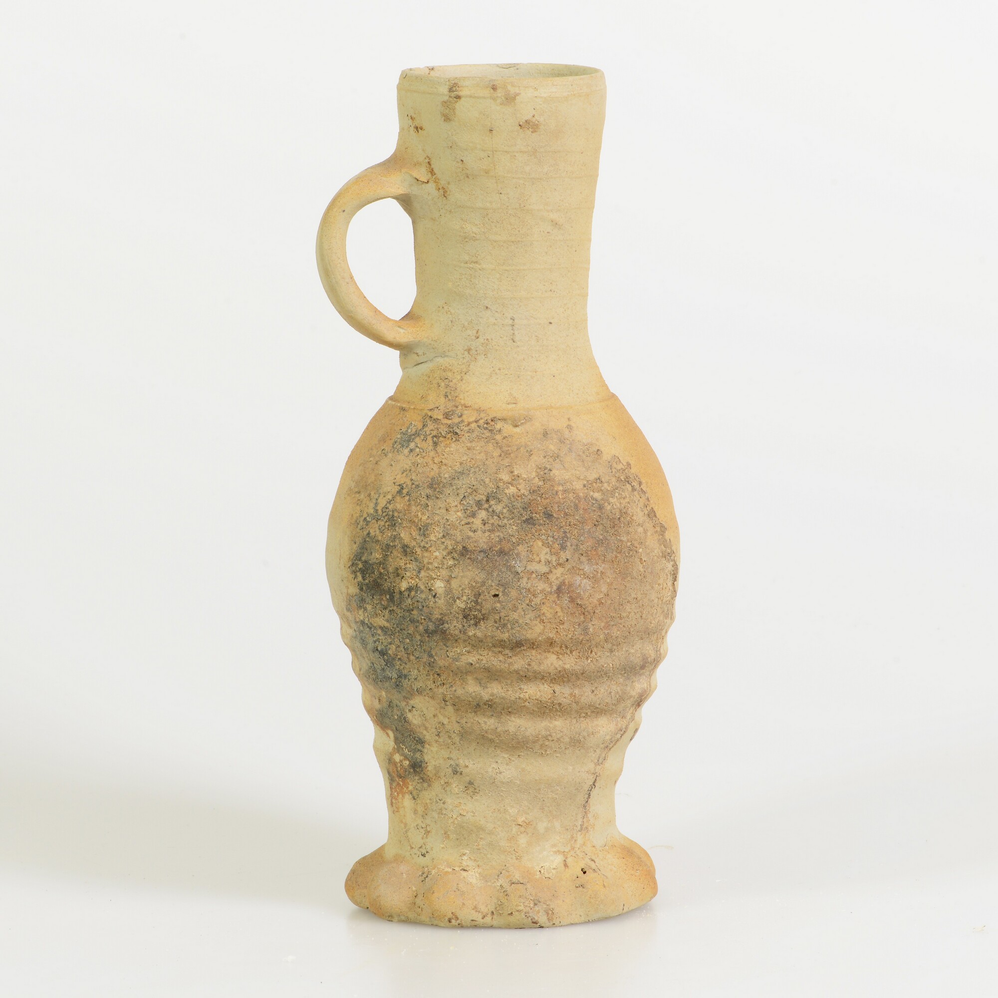 Kan; s1-kan-3; slanke hoge kan; geknepen standring; één lintoor; deukje in de buik; steengoed; productieplaats: Siegburg