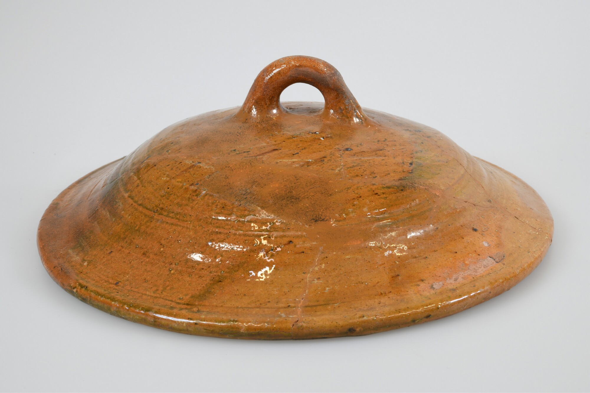 Deksel; r-dek-7; roodbakkend aardewerk; uitwendig loodglazuur; één lintoor