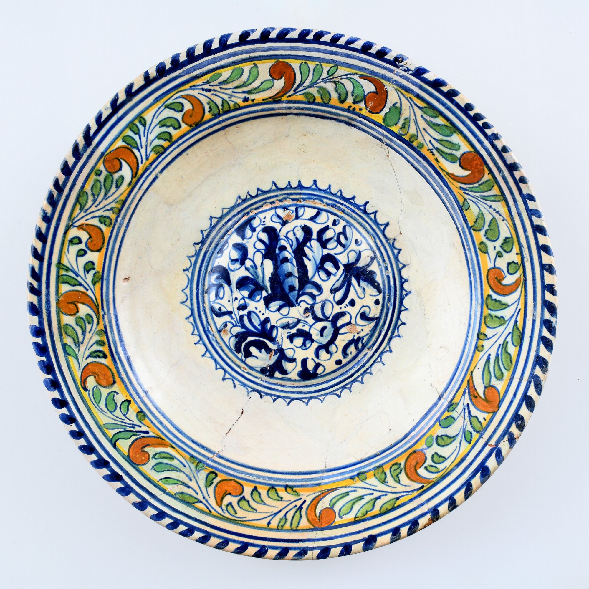 Bord; m-bor-13; majolica; inwendig tinglazuur, uitwendig loodglazuur; polychroom; sp: blauw florale decoratie; verhoogde spiegel; vl: bloemen in oranje, bladeren, kabelrand; standring