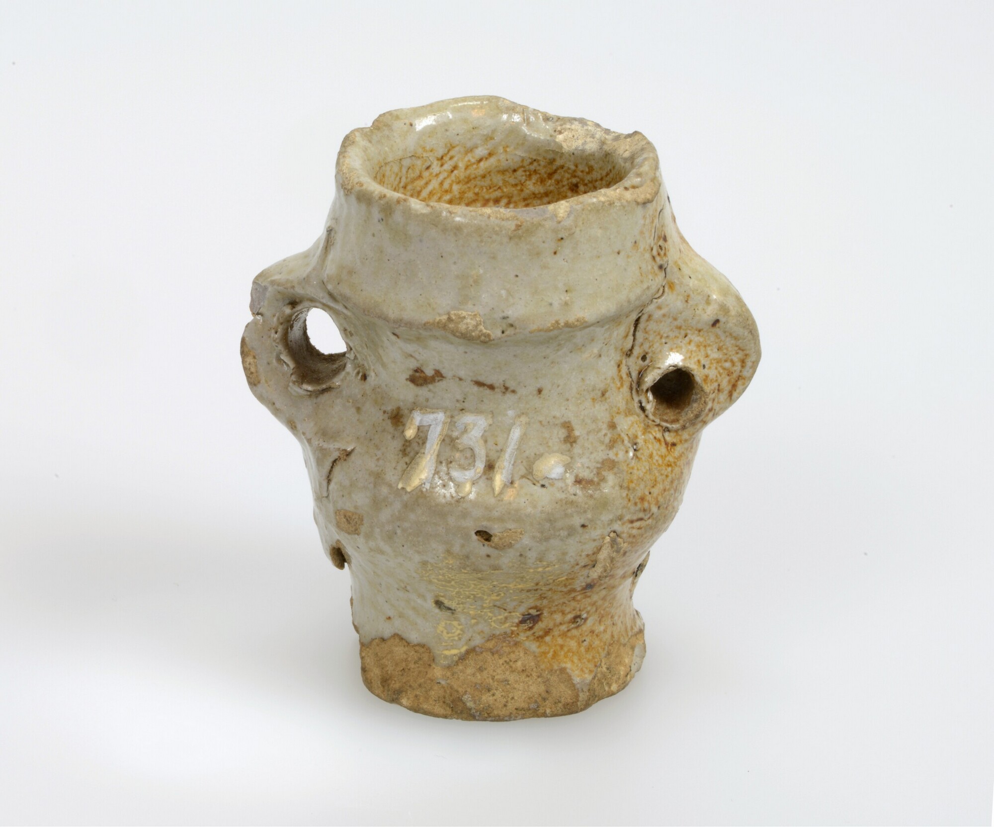 Spin- of inktpot; s2-kru-2; klein kruikje met afgeronde buikknik en kraagrand, standvlak; steengoed met oppervlaktebehandeling: ijzerengobe en zoutglazuur; herkomst: Raeren, Rijnland