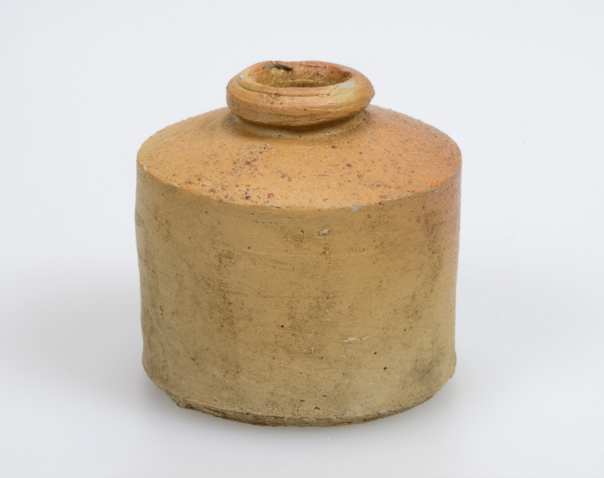 Inktpot; s2-ink-3; cilindrische inktpot met conische schouder, standvlak; industrieel steengoed (brown salt-glazed stoneware); zoutglazuur; herkomst: Engeland, Doulton, Lambeth?