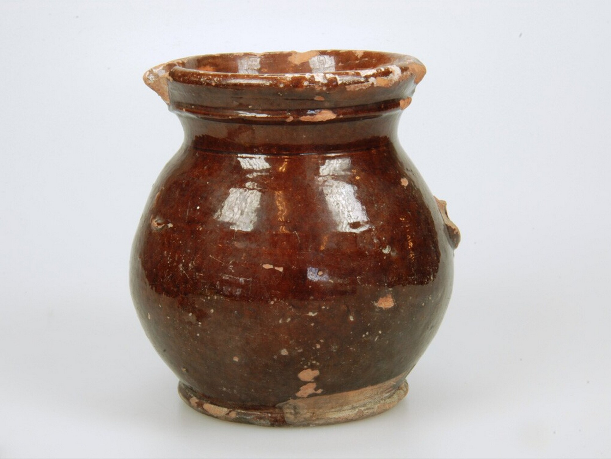 Kan; r-kan-23; wijdmondige kan met buik geleidelijk overgaand in uitgebogen hoge hals,standvoet; lintoor (ontbreekt); schenklip; roodbakkend aardewerk; loodglazuur, bruin aan de buitenzijde, witte kleislib aan de binnenzijde; herkomst; Gouda