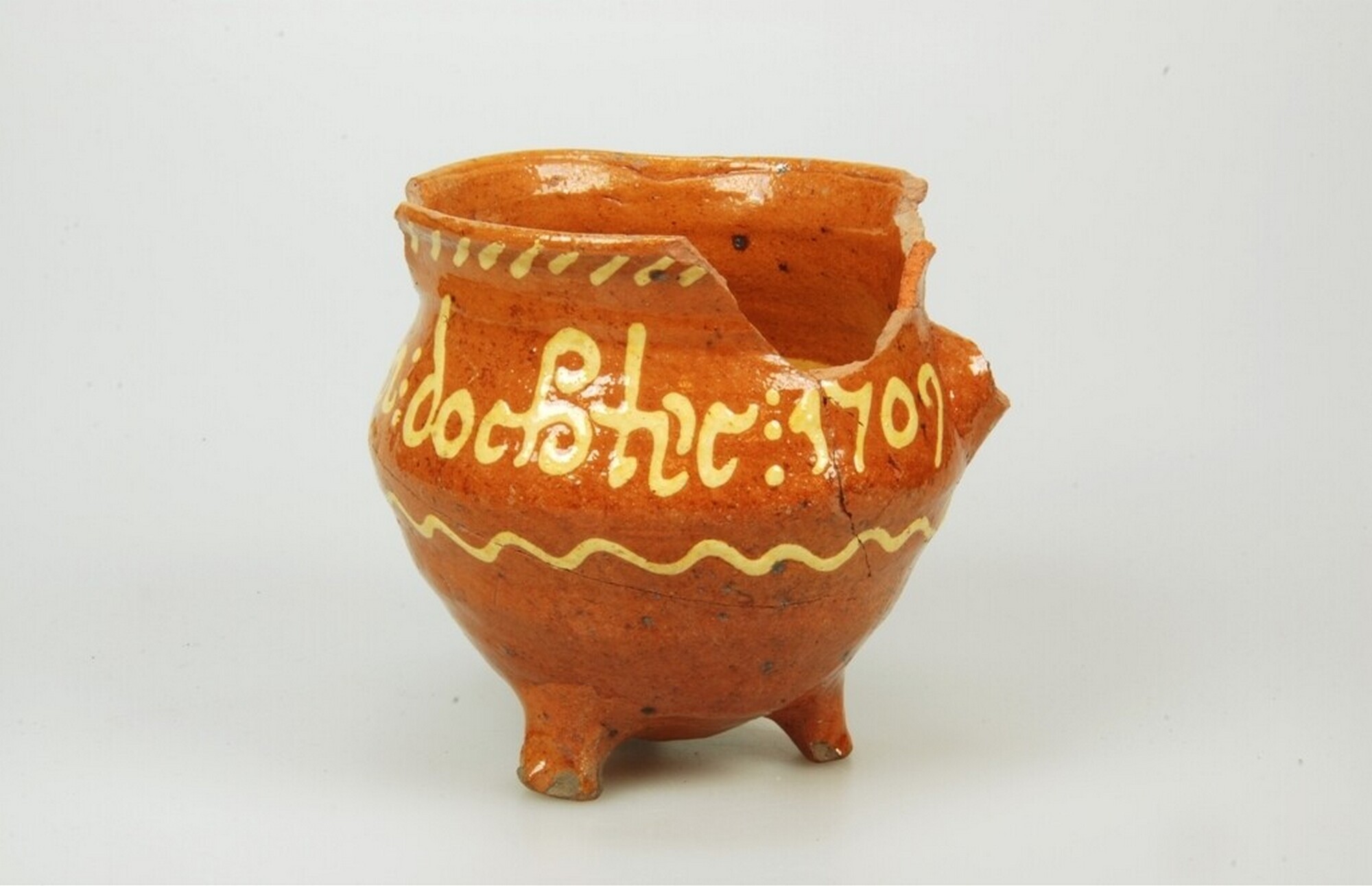 Grape; r-gra-87; roodbakkend aardewerk/Noord-Hollands slibversierd aardewerk; in- en uitwendig loodglazuur; inwendig deels slibversiring, uitwendig: JANNIETIE TAMIS DOCHTER 1709 in gele slib (ringeloor) met daaronder slingerlijn en daarboven streepjes; drie poten; verticaal worstoor (ontbreekt); schenklip (grotendeels afgebroken); herkomst: Alkmaar