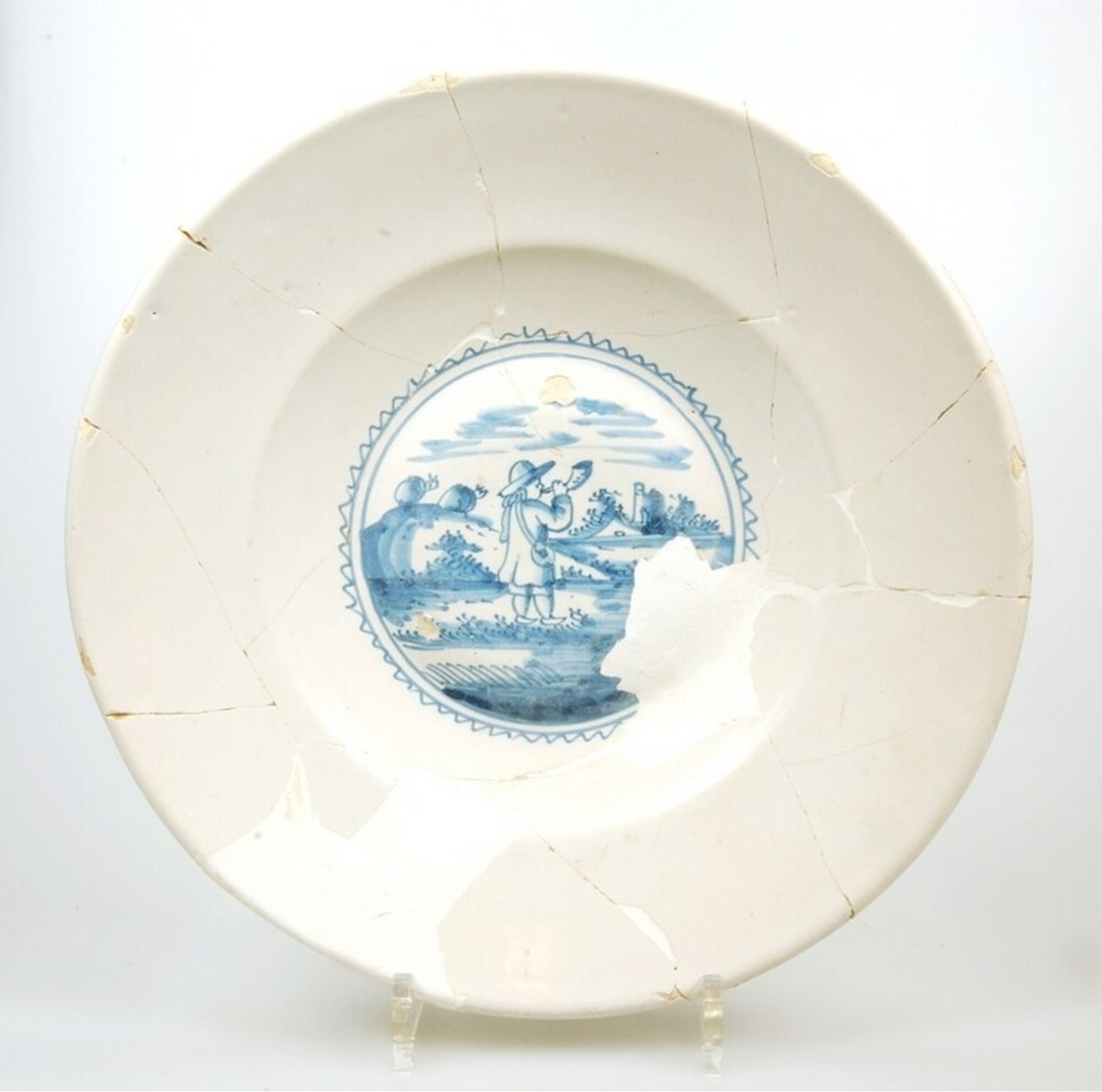 Pannenkoekenbord/schotel; m-bor-13; Nederlands majolica; inwendig tinglazuur, uitwendig loodglazuur; blauw op wit: spiegel: landschap in blauw met hoornblazende herder; standring, opgebolde ziel; herkomst: Holland, Friesland