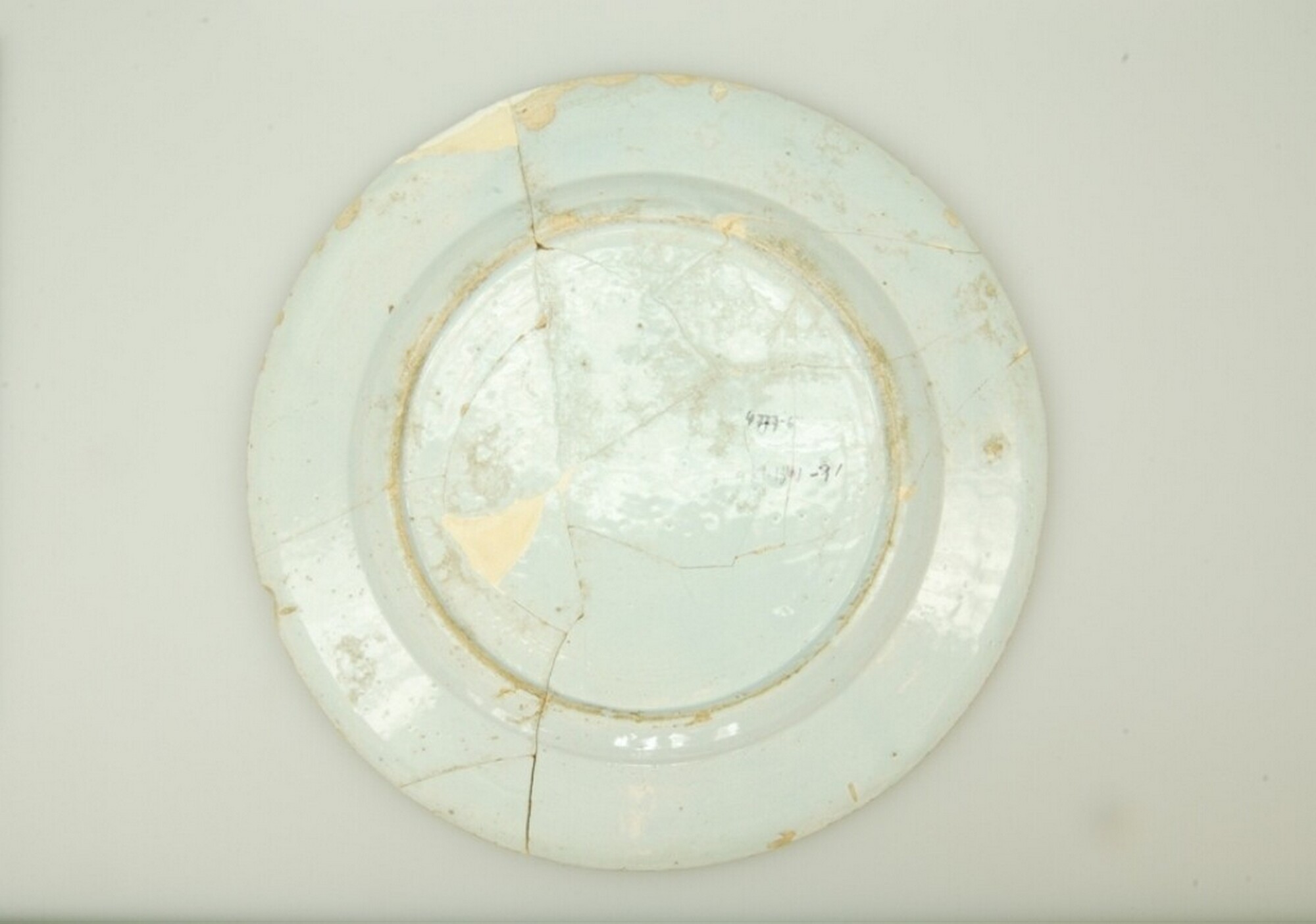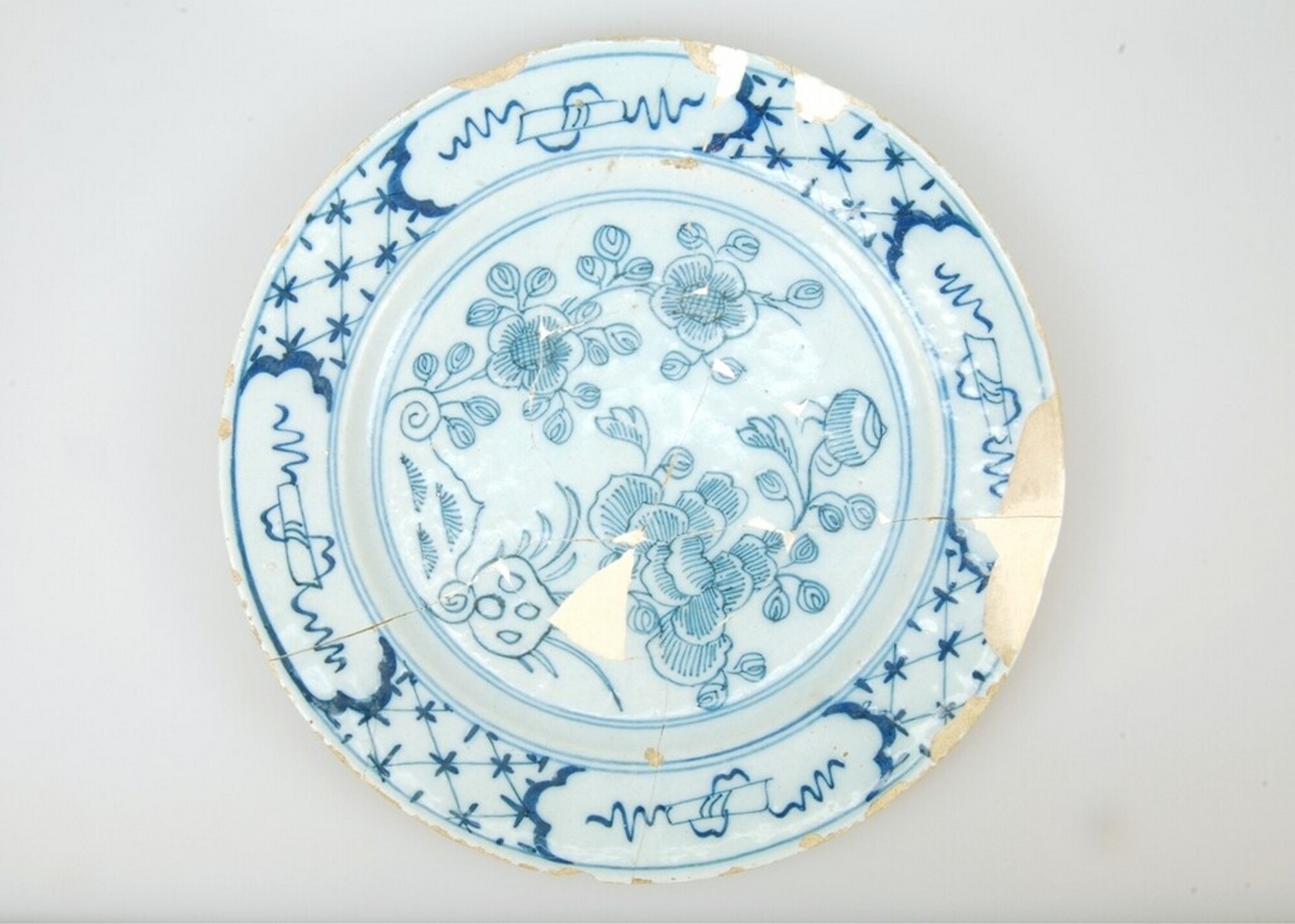 Bord; f-bor-6; Nederlands faience; voor- en achterzijde tinglazuur; spiegel en vlag: florale motieven in blauw; uitgeschraapte standring; herkomst: Delft